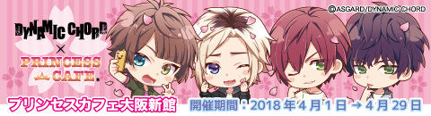 大人気ゲーム & TVアニメ「DYNAMIC CHORD」× プリンセスカフェ全国6店舗にて4/1から「ダイナミックコード」のコラボカフェ再び開催中!!(※ 店舗により期間が異なります) 作品やキャラクターしたオリジナルメニューやグッズが登場!!コラボレーション開催期間はプリンセスカフェ名古屋栄館・大阪新館・福岡館が2018年4月1日~4月29日まで、プリンセスカフェ池袋新館が2018年4月16日~5月20日まで、プリンセスカフェ秋葉原館が2018年5月1日~5月31日まで!!