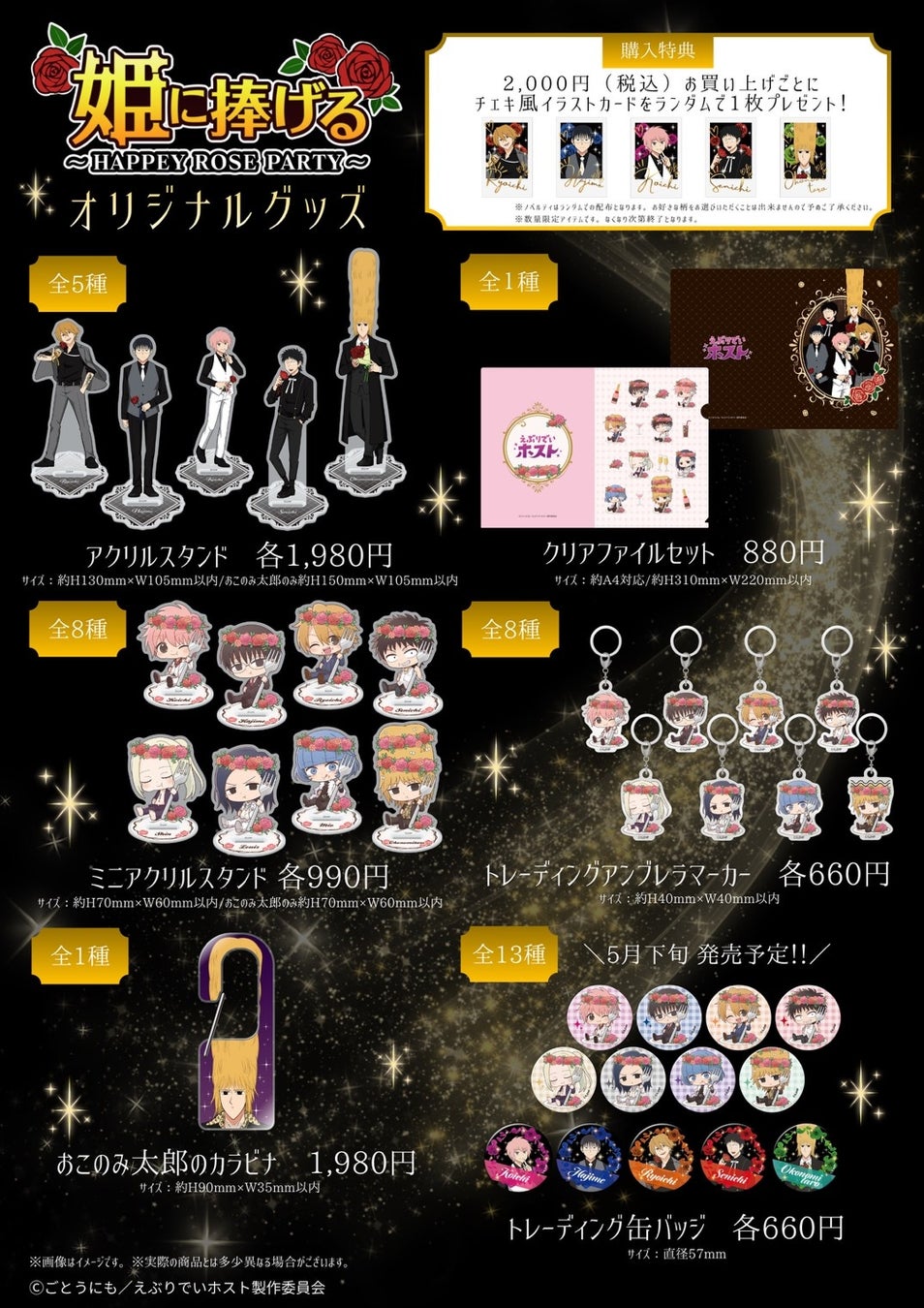 さらに、コーイチ・ハジメ・リョーイチ・センイチ・おこのみ太郎ら5人のホストが、バラを手に「姫」をお迎えする豪華な描き下ろしイラストを使用したオリジナルグッズ、限定ノベルティーも!