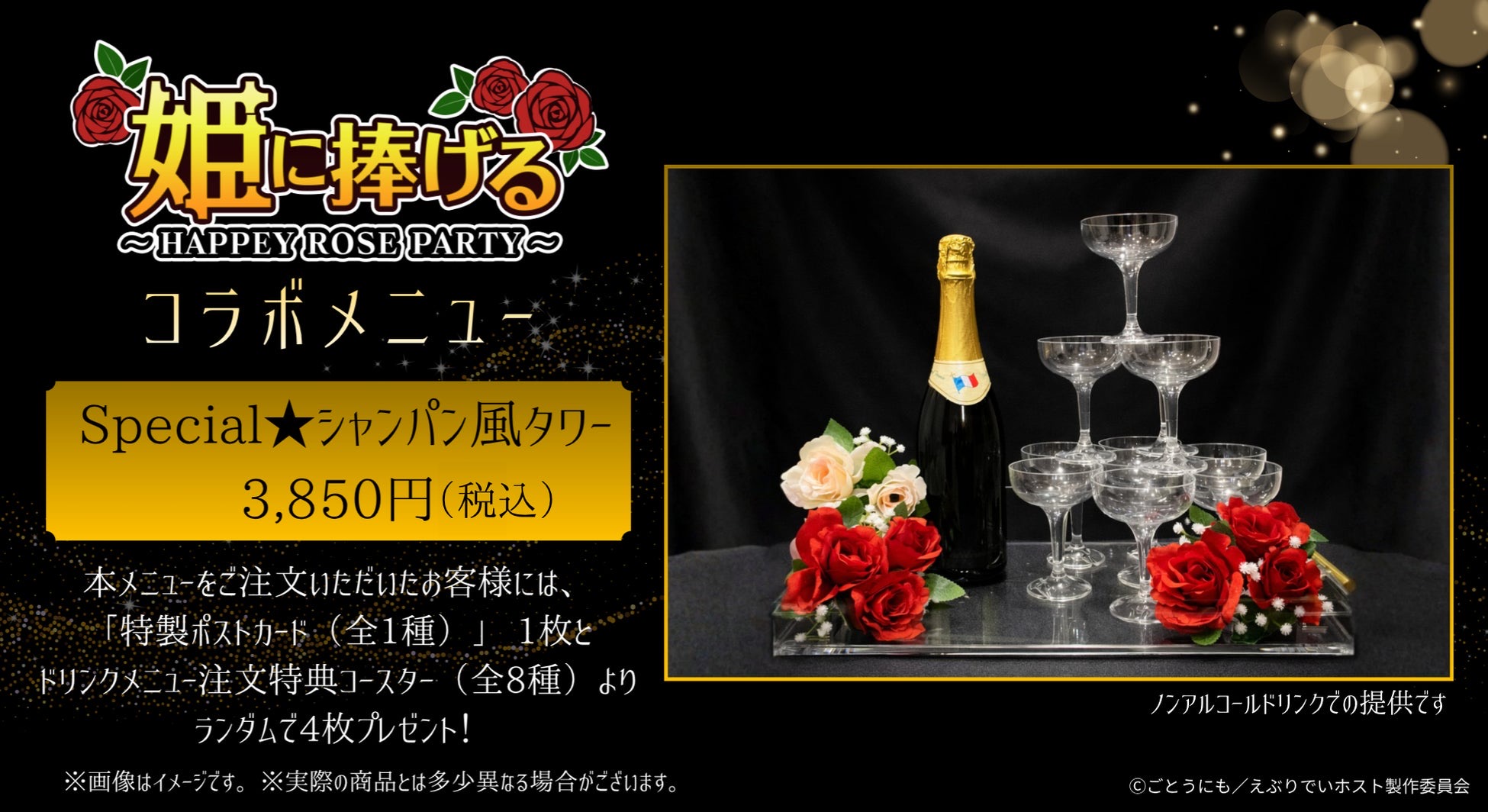「えぶりでいホスト」コラボカフェでは、各キャラクターの個性や所属クラブをイメージした本格メニューが楽しめるほか、事前予約限定の「Special★シャンパン風タワー」が登場!