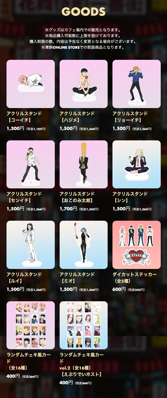 「えぶりでいホストCLUB★CAFE in 池袋」では、作品の世界観をイメージしたフードやドリンクが登場するほか、「ステッカー」や「コースター」「トレカ」などのオリジナル特典も!