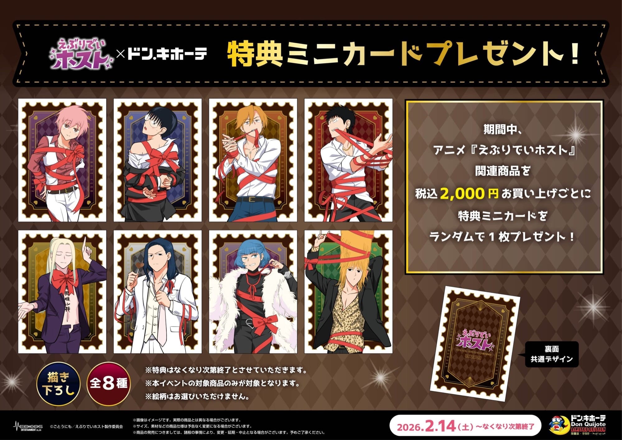 「えぶりでいホスト × ドンキホーテ」にて、グッズをお買い上げ2,000円毎に特典として「ミニカード 全8種」がランダムに1枚プレゼントされる。