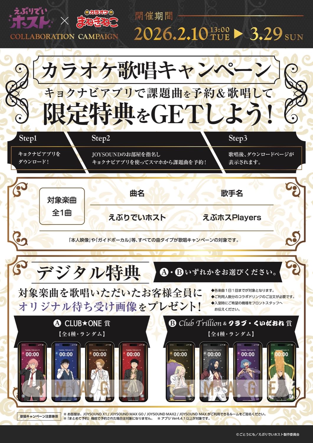 2026年2月10日よりカラオケまねきねこにて開催される「えぶりでいホスト」コラボではコースター付きのドリンクメニューが登場!