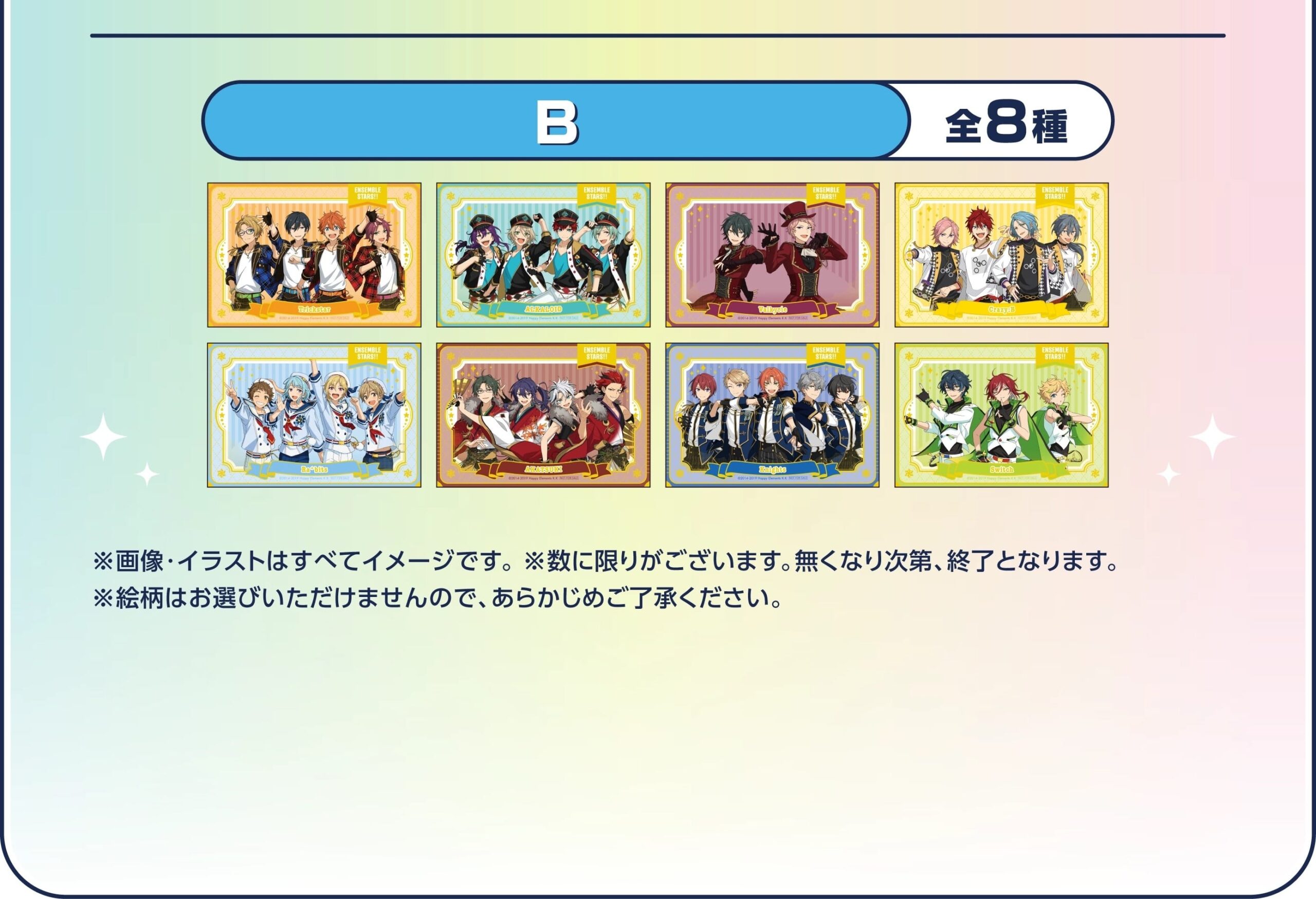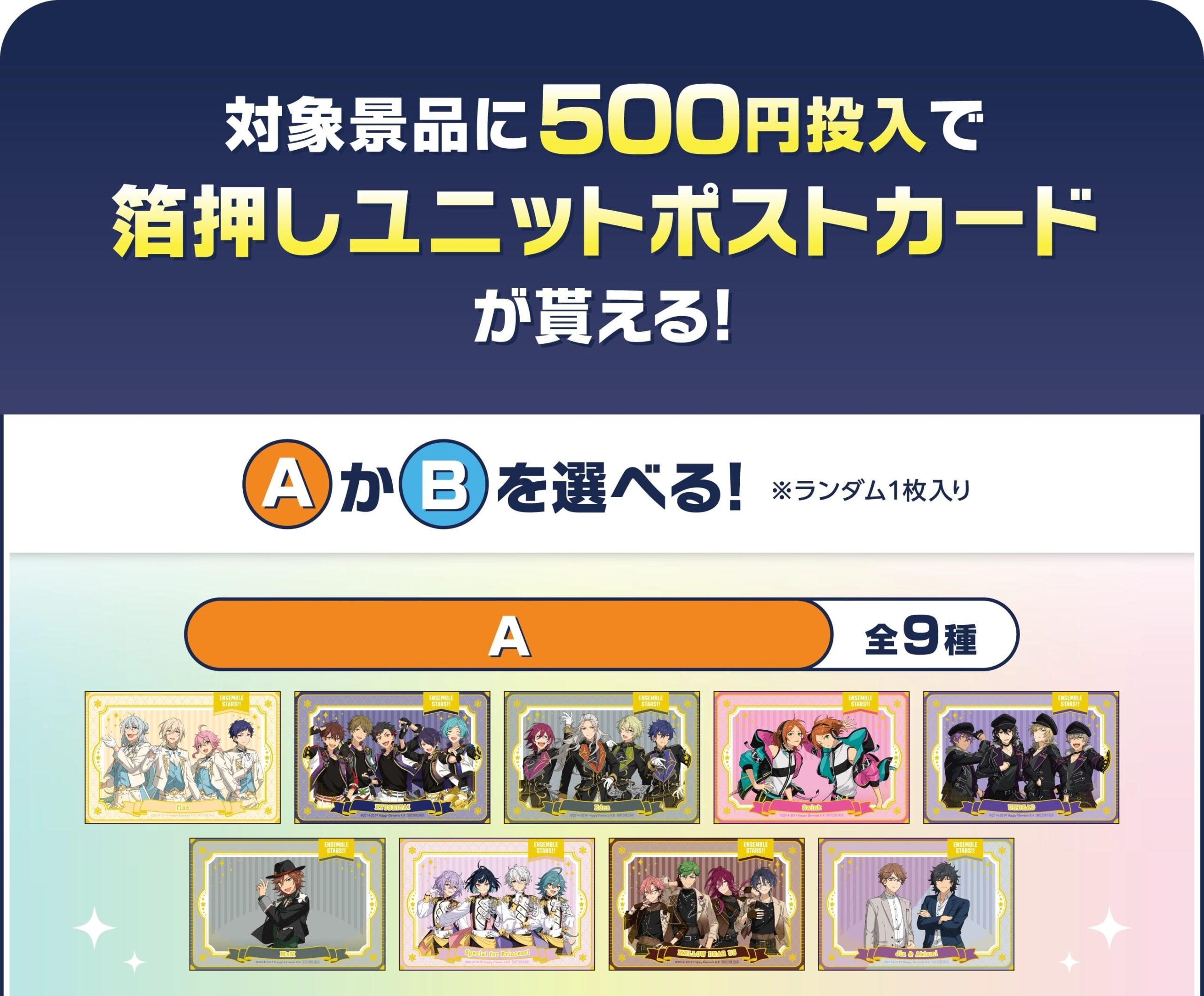 「あんさんぶるスターズ!! × GiGO」キャンペーンでは、対象景品に500円投入すると特典として「箔押しユニットポストカード」をA : 9種・B : 9種どちらかよりランダムに1枚プレゼント!