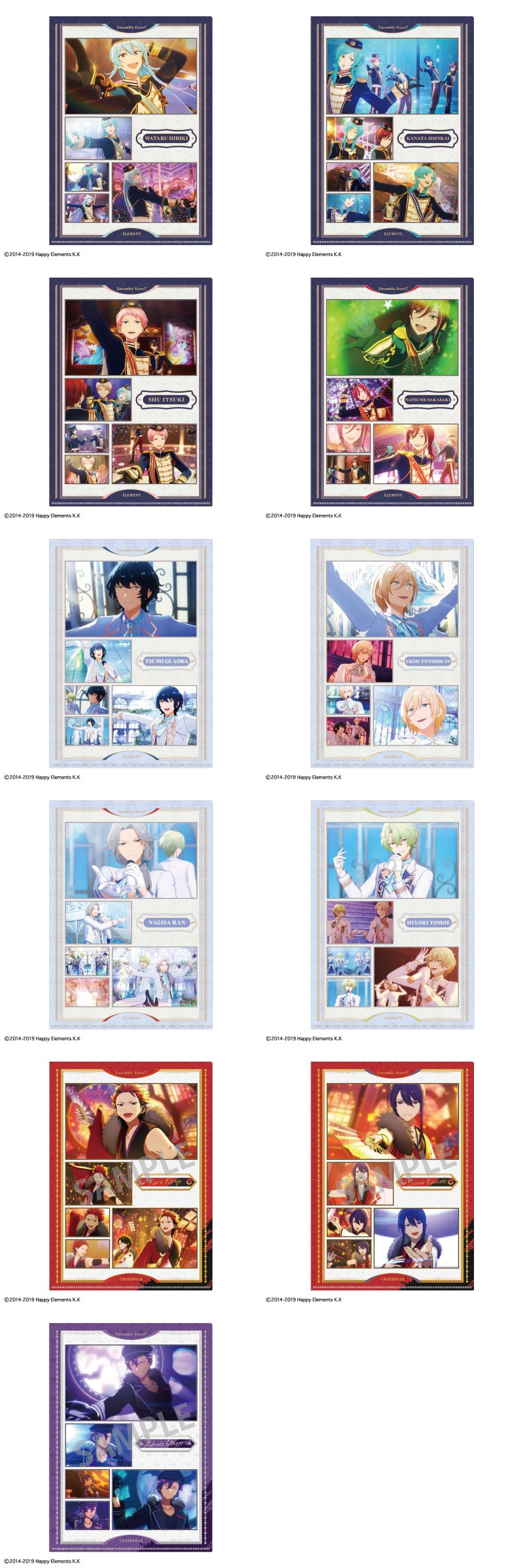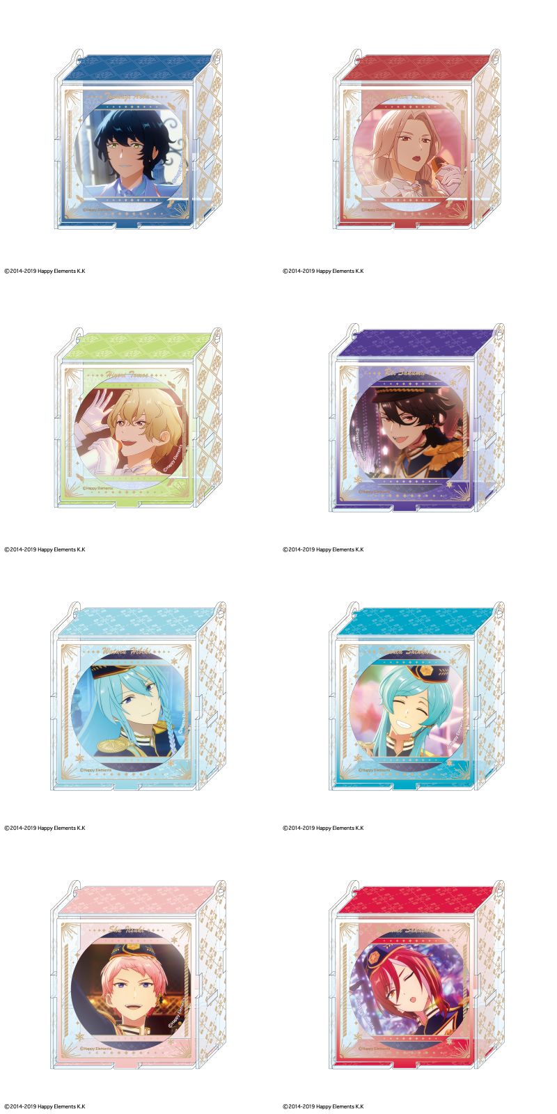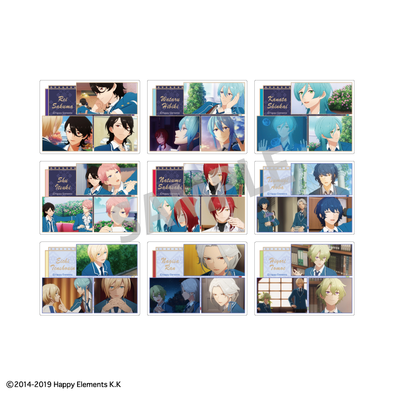 追憶ストーリーに登場した各アイドルユニットを描いた「缶バッジ」「アクリルキーホルダー」「ミニ色紙」「クリアファイル」「フレームアクリルスタンド」など全14種がラインナップ。