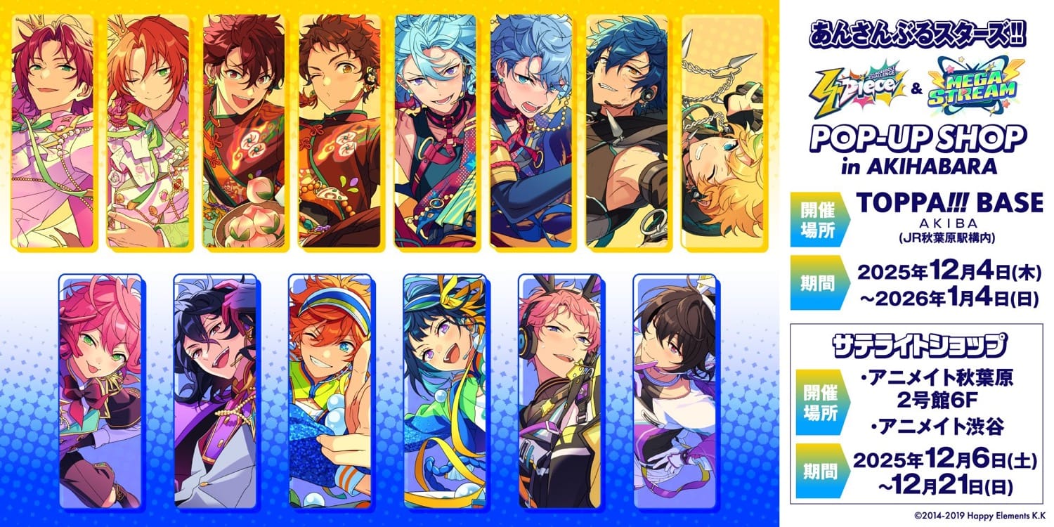 Happy Elementsが手掛ける大人気スマホ向けアプリゲーム「あんさんぶるスターズ!! (あんスタ)」のポップアップストアが、TOPPA!!! BASE AKIBAにて2025年12月4日〜2026年1月4日まで開催される。