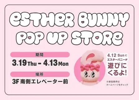 「エスターバニー」ポップアップストアでは、3F 南側エレベーター前にエスターバニーが登場し、エスターバニーの来店イベントを開催!