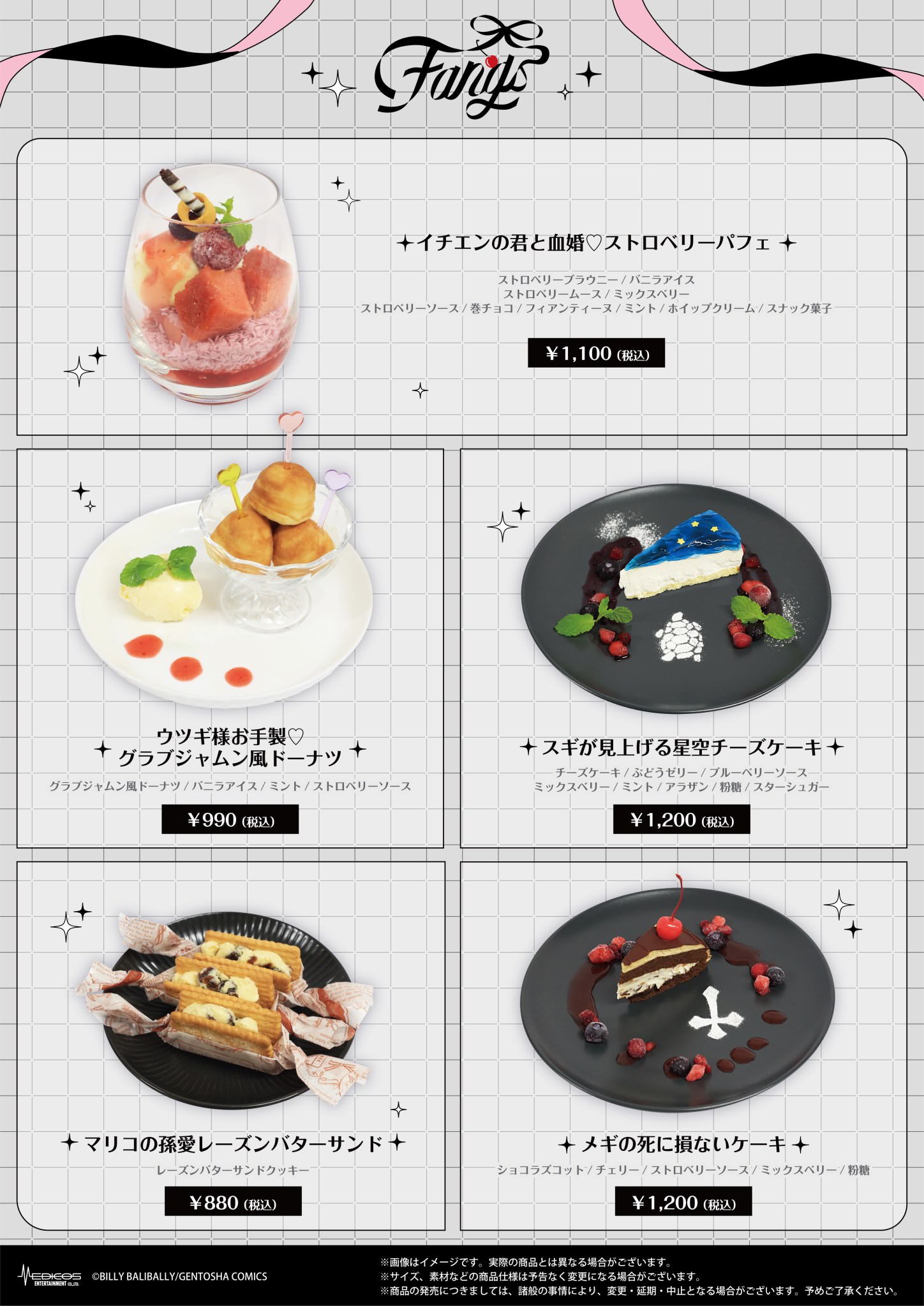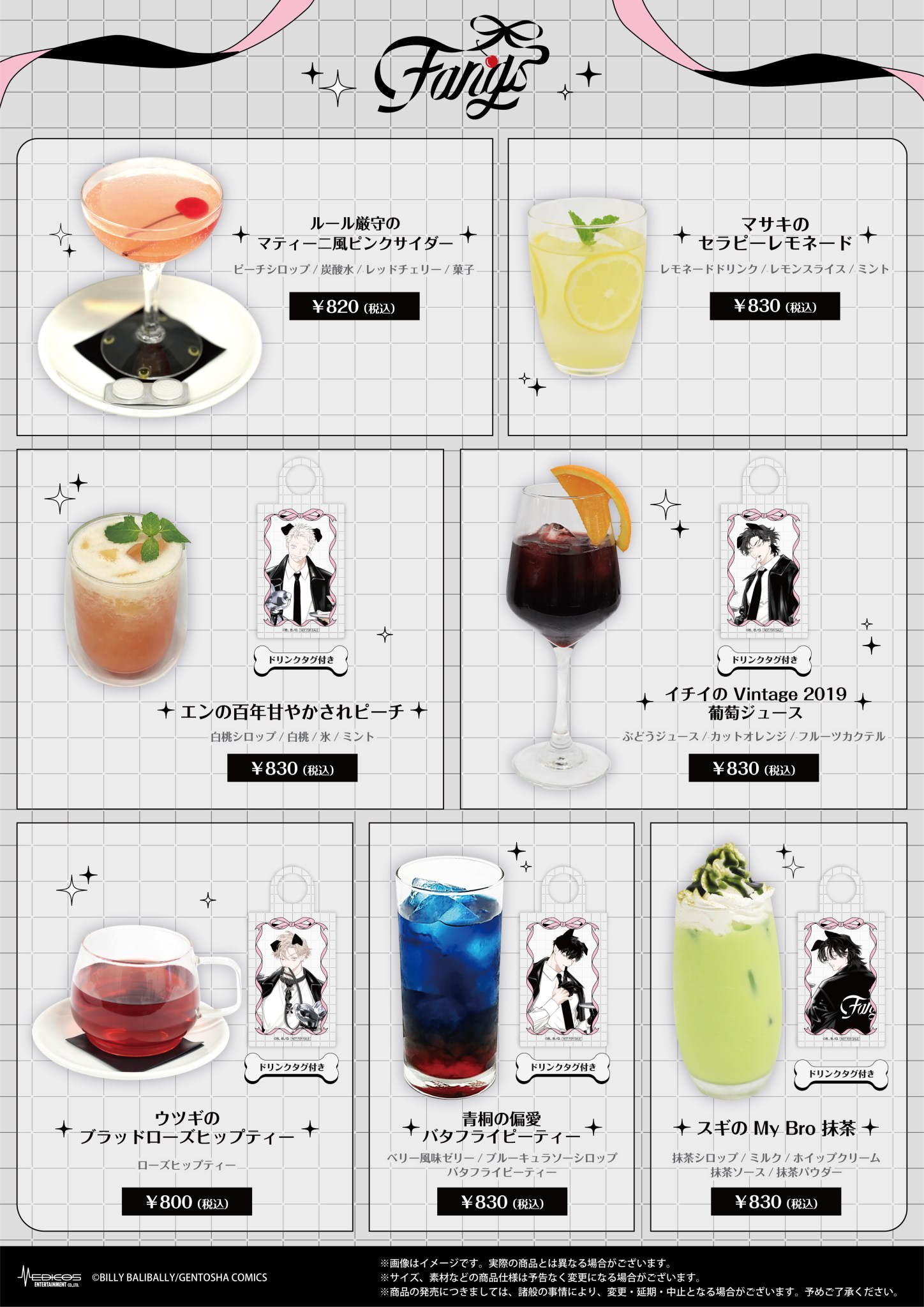 フードメニューには特典として「ミニカード」が付く「イチエンのミニピザパーティー」などが、ドリンクメニューには各キャラクターをイメージしたカラーや素材を使用した多彩なメニューが用意されている。