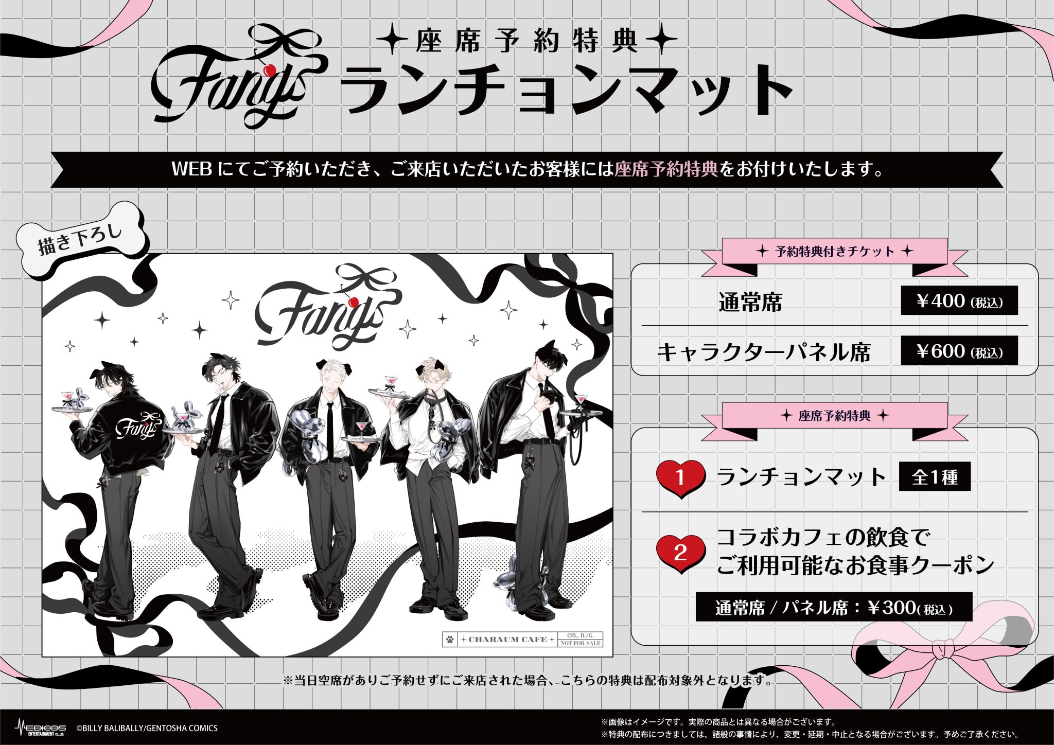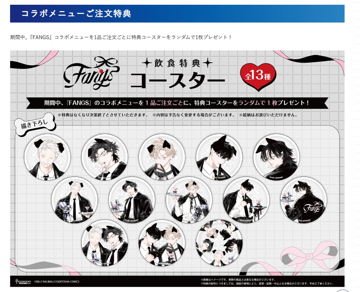 「FANGS」コラボカフェでは、WEBにて事前予約の上来店すると「ランチョンマット (全1種)」と、カフェの飲食で利用可能な「300円分のお食事クーポン」をセットで、コラボメニュー1品ご注文ごとに「コースター (全13種)」をランダムで1枚プレゼント!