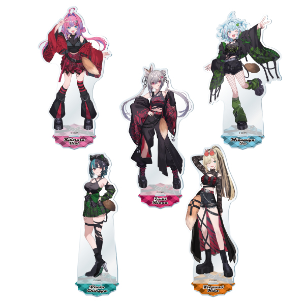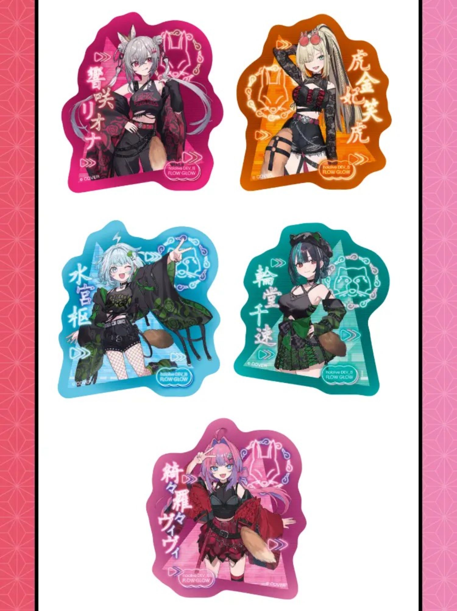 「FLOW GLOW × ファミリーマート全国」では、対象商品を購入した方に、“和風パンク”をイメージした響咲リオナさん・虎金妃笑虎さん・水宮枢さん・輪堂千速さん・綺々羅々ヴィヴィさんの描き下ろしイラストを使用した「ステッカー」をプレゼント。