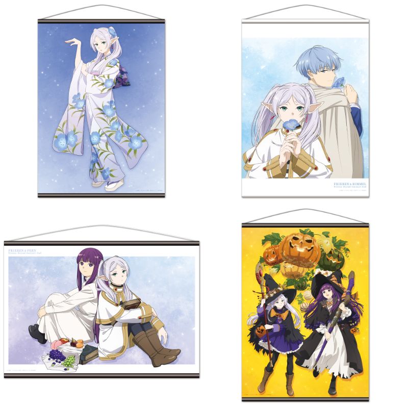 晴れ着姿のフリーレンや、ハロウィン衣装のフェルンたちを描いた新商品が登場。「蒼月草」を手に持つフリーレンとヒンメル2人の美麗イラストを使用した「MOKUスタ」や「B2タペストリー」などヒンフリのグッズが多数ラインナップ。