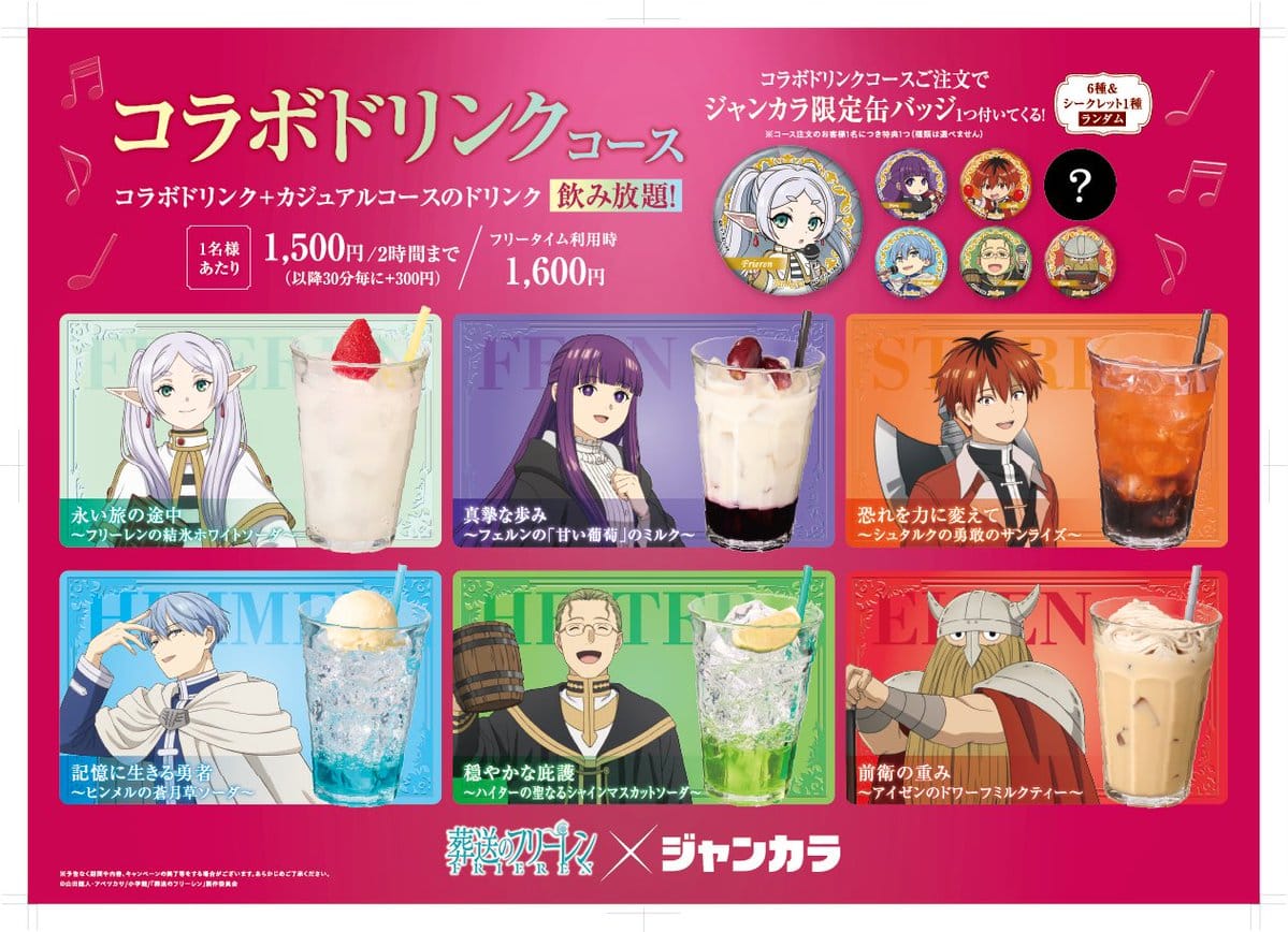 「葬送のフリーレン × ジャンカラ全国」では、全国14店舗でコラボルームが実施されるほか、全店で飲み放題のコラボドリンクコースを展開。コラボドリンクコースを注文した方には「限定缶バッジ」を1個プレゼント!