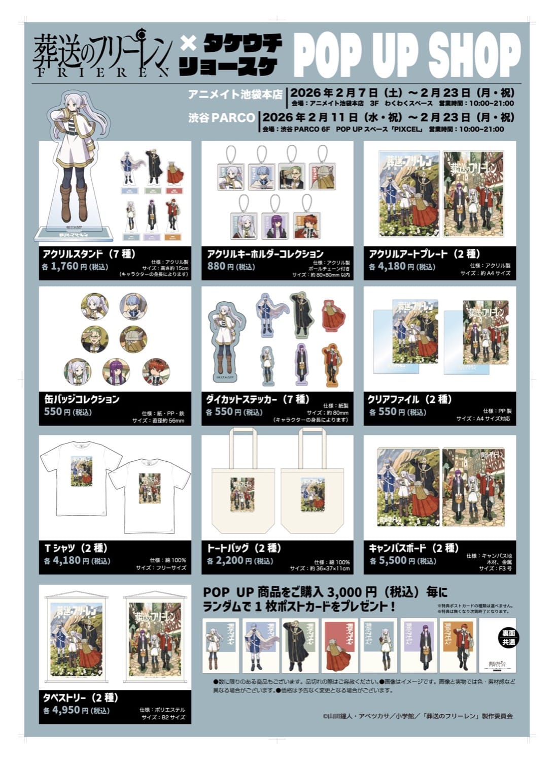 ポップアップストアにて「フリーレン × タケウチリョースケ」グッズを3,000円 (税込) ごとに、特典として「ポストカード 全7種」の中からランダムで1枚がプレゼントされる。