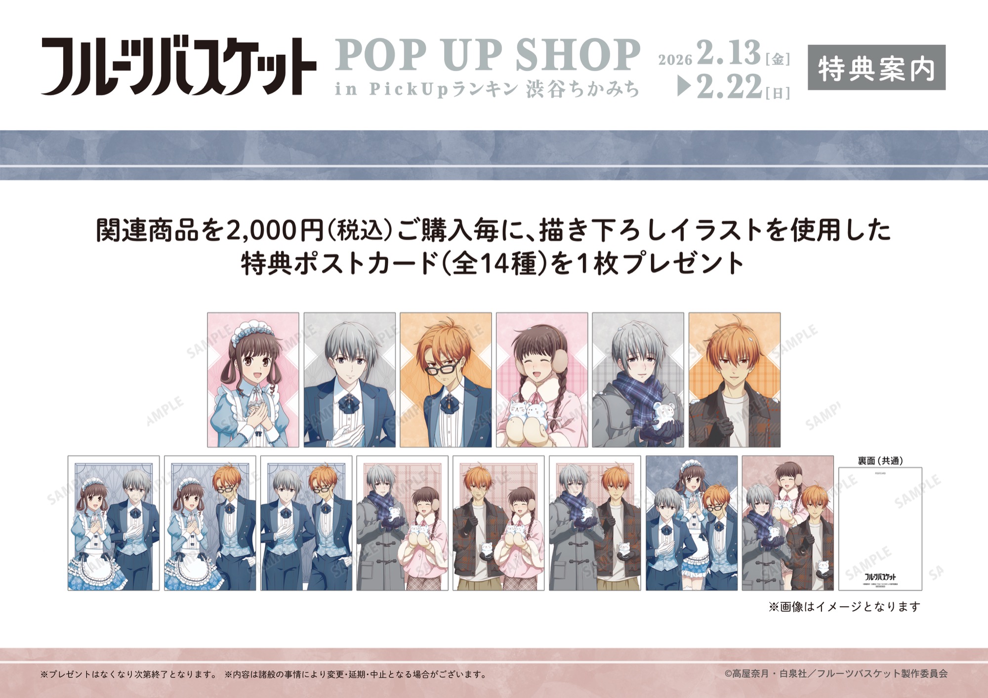 「フルーツバスケット」ポップアップストアにて、グッズをお買い上げ2,000円毎に特典として「ポストカード 全14種」がランダムに1枚プレゼントされる。