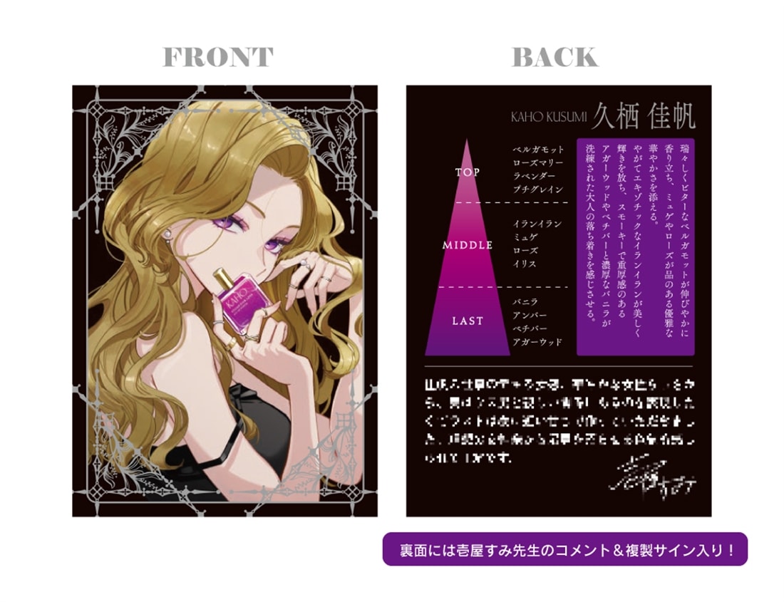 壱屋すみ先生が香りからパッケージデザインまで完全監修した香水で、美麗描き下ろしイラストを使用した付属のイラストカードはじっくり観賞用として飾ってもよし。