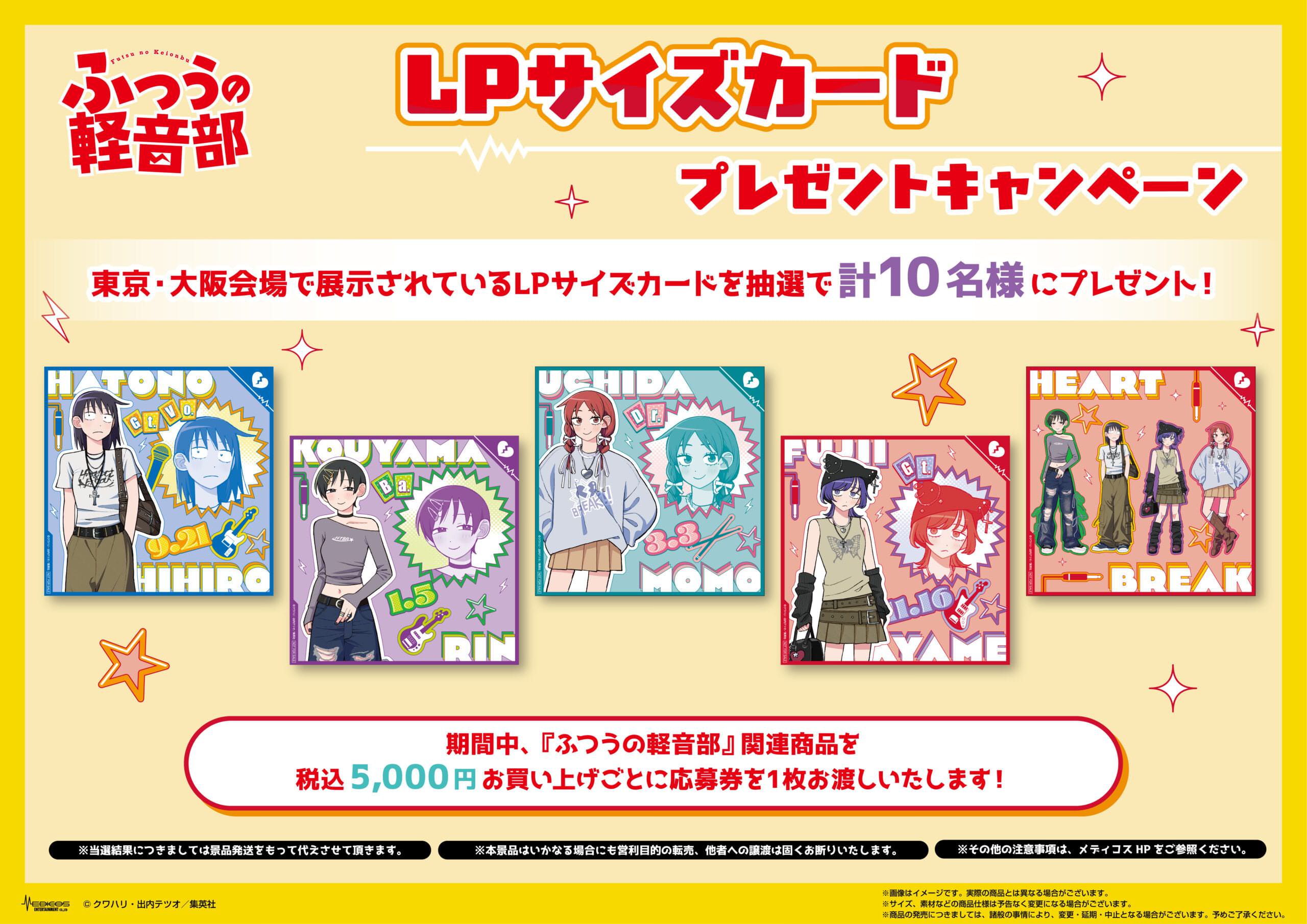 さらに、関連グッズをお買い上げ2,000円(税込)ごとに特典として描き下ろしノベルティー「ミニカード 全5種」がランダムに1枚プレゼントされるほか、5,000円(税込)ごとに1枚貰える応募券で応募すると抽選で10名の方に会場に展示されている「LPカード」をプレゼント!