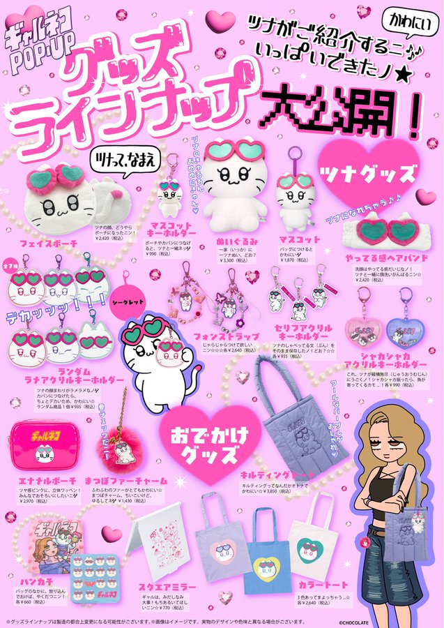 「ギャルネコ」ポップアップストアでは、ツナとギャルのかわいい世界観のイラストを使用した新作グッズが多数販売される。