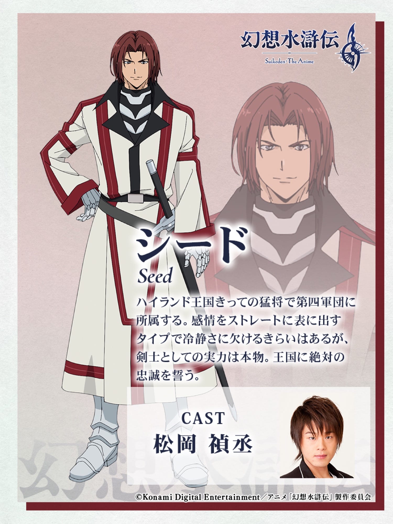 ハイランド王国 第四軍団に所属する知将・クルガン役を笠間淳さん、同隊の猛将・シード役を松岡禎丞さん、27の真の紋章のひとつ「門の紋章」を宿す女性・レックナートを潘めぐみさんが演じる。