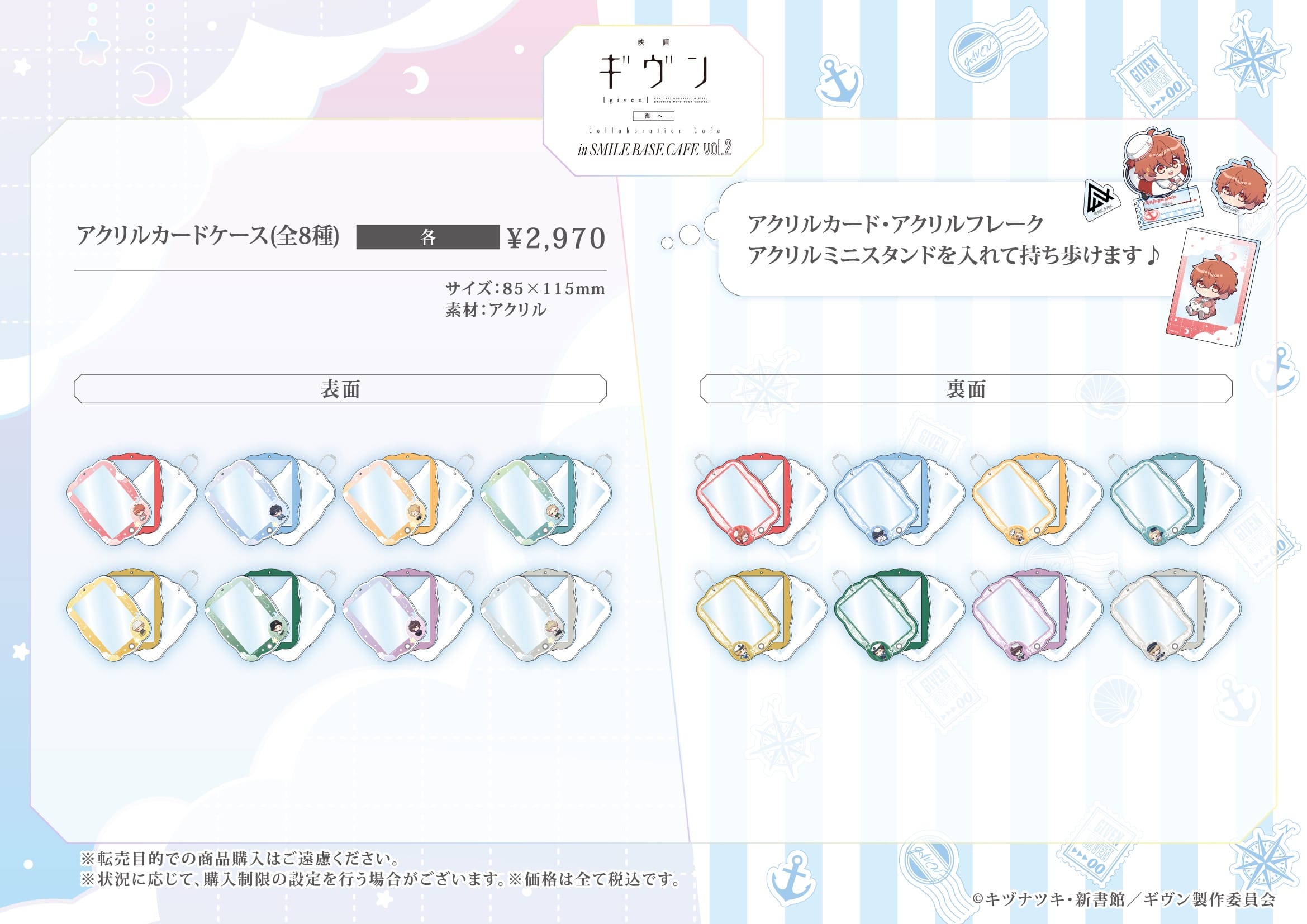 「ギヴン 海へ カフェ in SMILE BASE CAFE3店舗」コラボでは、コラボメニューの注文やグッズの購入などに応じて各種ノベルティーがプレゼントされる。