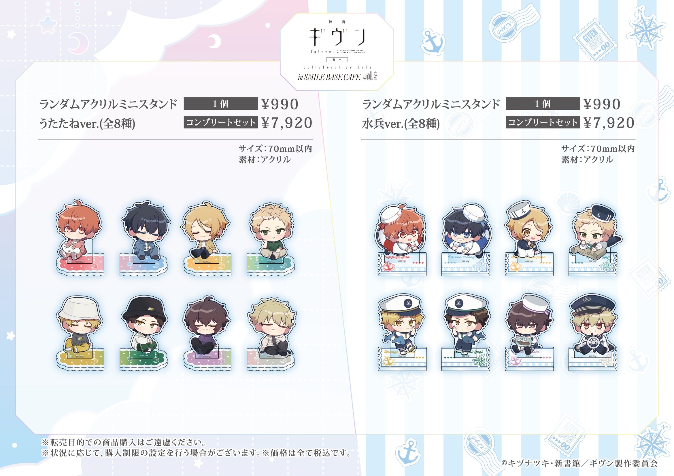 2026年3月2日より順次開催される「ギヴン」カフェでは、マリンルックの描き起こしミニキャライラストを使用したコラボカフェ限定グッズが多数登場!