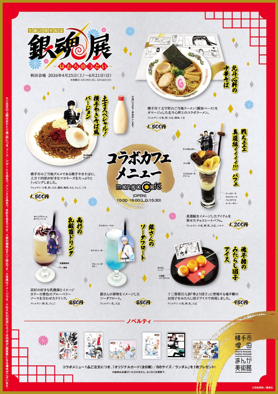 空知英秋先生による“SF人情なんちゃって時代劇コメディー”漫画「銀魂」の20周年を記念した展示会『生誕20周年記念 銀魂展 ~はたちのつどい~』が、横手市増田まんが美術館にて開催されることを記念し、2026年4月25日〜6月21日までコラボカフェが開催!