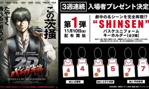 2023年11月10日より全国の上映劇場にて配布される、「銀魂オンシアター2D バラガキ篇」の入場者特典第1弾には、4番・キャプテンの近藤勲モデル、5番・副キャプテンの土方十四郎モデル、そして7番・ドSモールフォワードの沖田総悟モデルの全3種類がラインナップ。