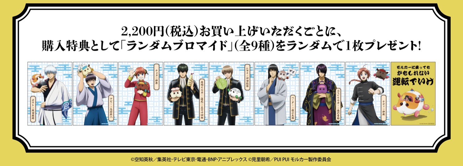 「銀魂 × PUI PUI モルカー」ポップアップストアにて、グッズをお買い上げ2,200円毎に特典として「ブロマイド 全9種」がランダムに1枚プレゼントされる。