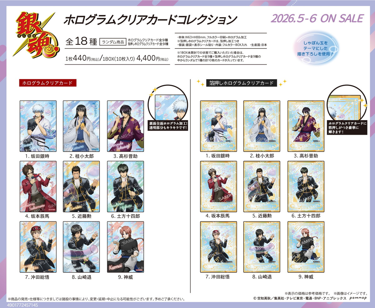 銀さん達がしゃぼん玉を膨らませたり、眺めたりしている姿を描いた『しゃぼん玉』シリーズより、「ホログラムクリアカードコレクション」と「アクリルキーホルダーコレクション」が新登場。