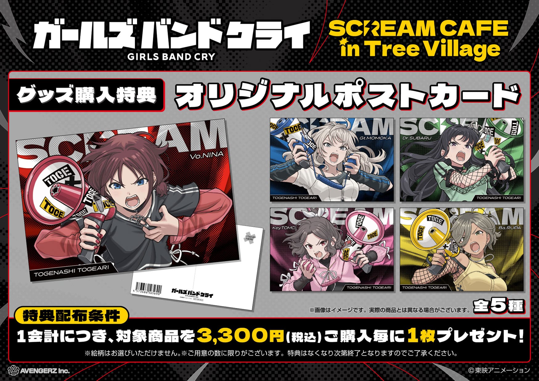 なお、グッズ購入1会計につき、対象商品を3,300円(税込)購入ごとに、特典として「オリジナルポストカード 全5種」の中からランダムで1枚をプレゼント!