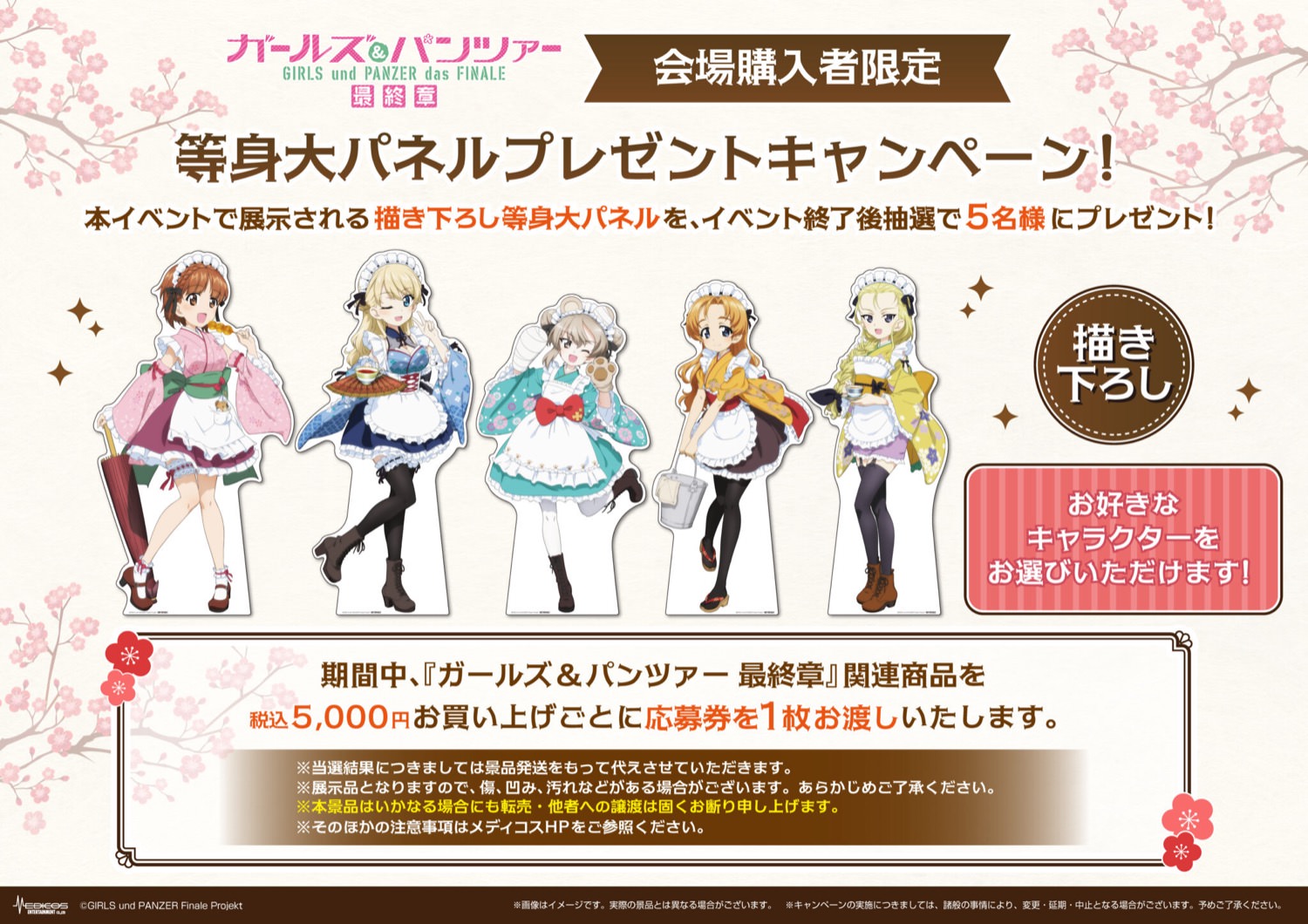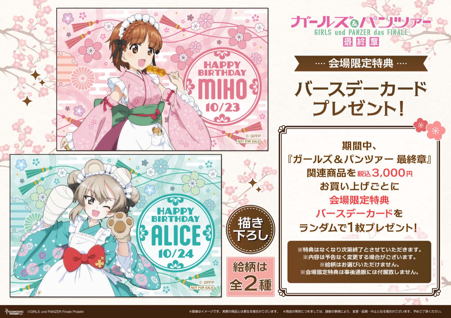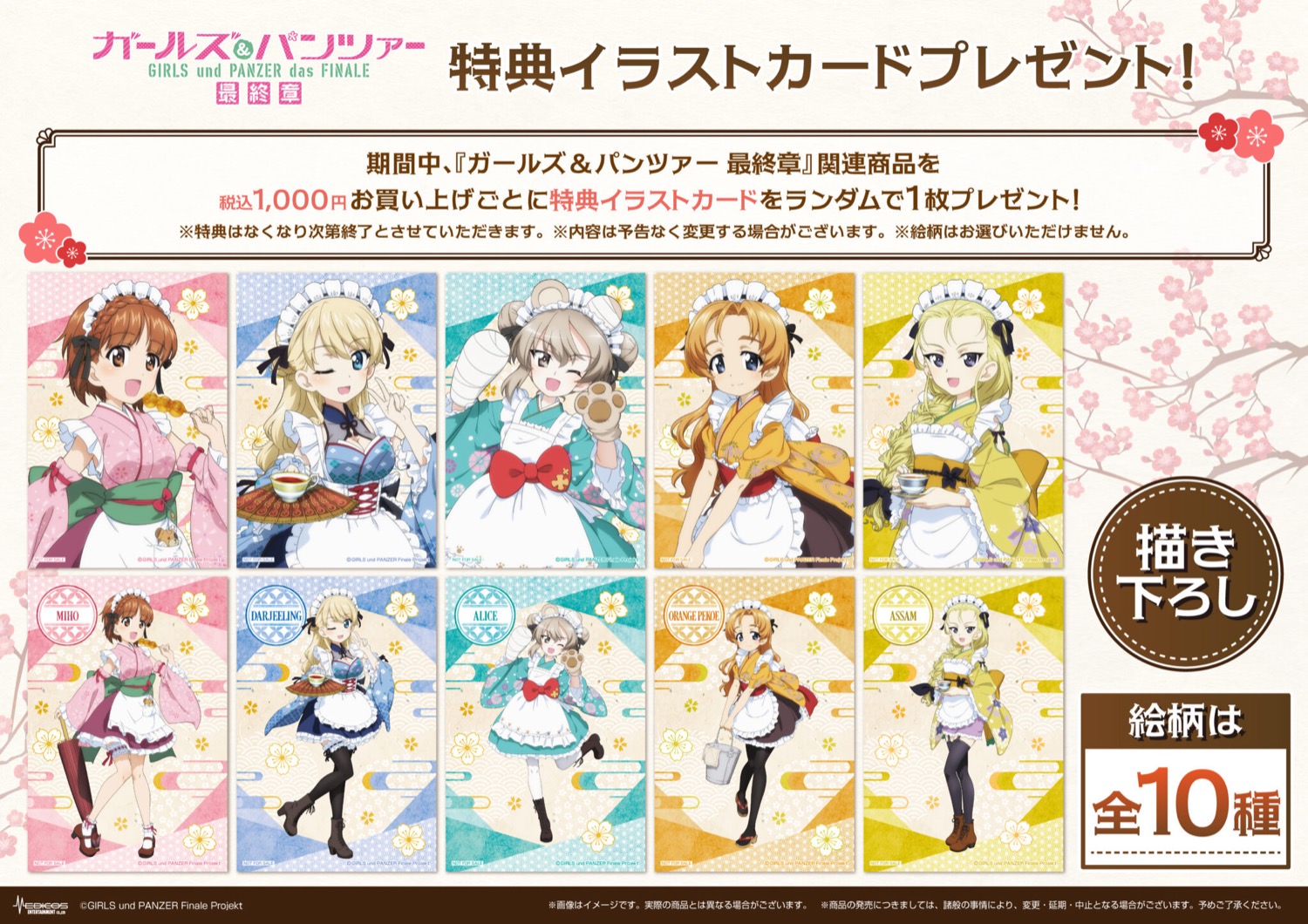 「ガールズ&パンツァー 最終章」ポップアップストアにて、グッズをお買い上げ1,000円毎に特典として「イラストカード 全10種」がランダムに1枚プレゼントされる。