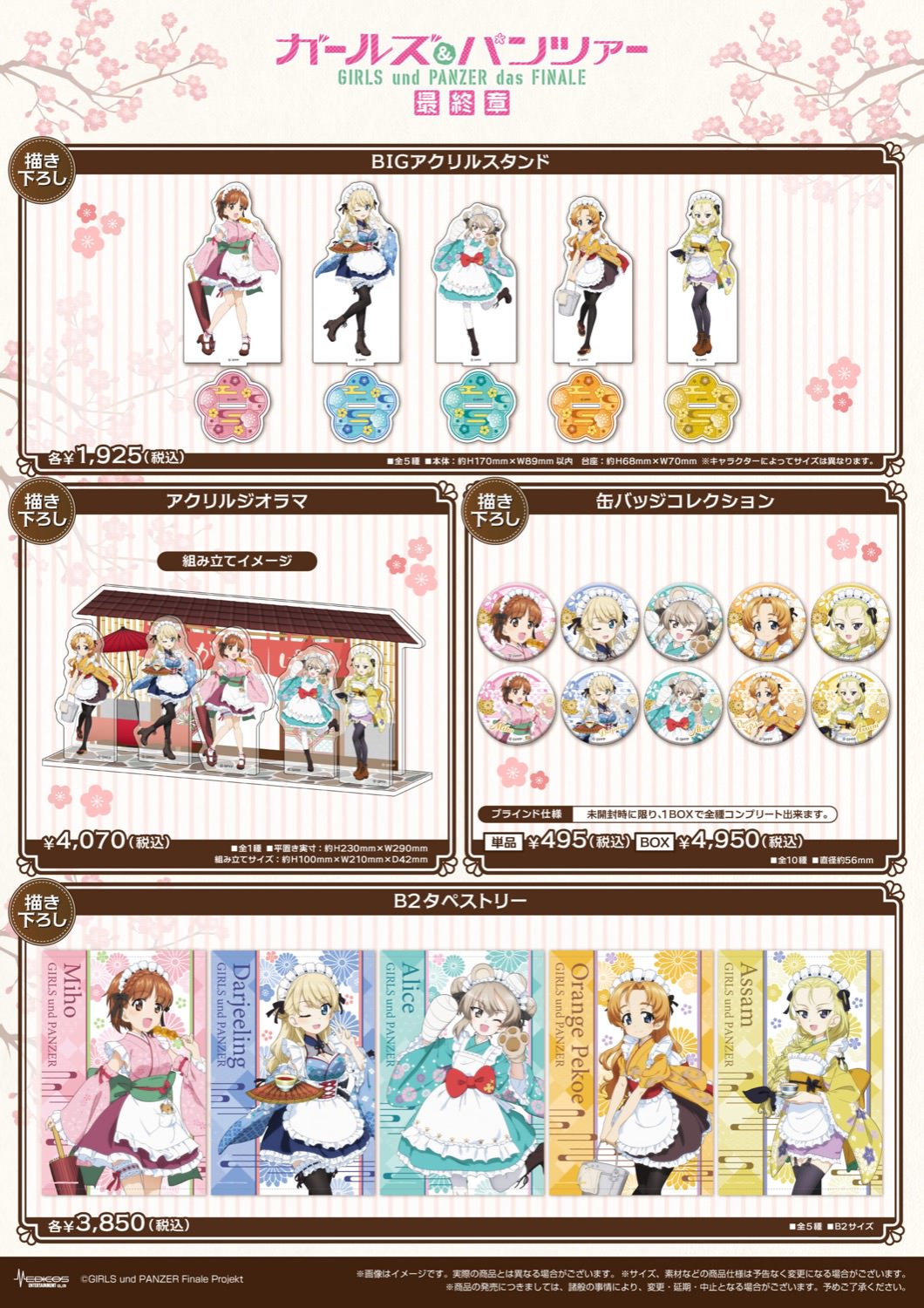 『和風メイド』がテーマの西住 みほ、ダージリン、島田 愛里寿、オレンジペコ、アッサム5人の可愛らしい新規描き下ろしイラストを使用した「アクリルジオラマ」「缶バッジコレクション」「BIGアクリルスタンド」などがラインナップ!
