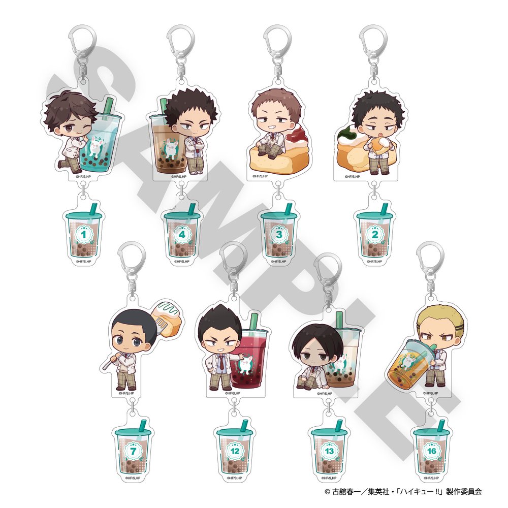 今回のコラボでは、青葉城西高校メンバーたちが、タピオカや台湾カステラを楽しんでいる姿に注目!そしてこの描きおこしイラストを使用した「アクリルキーホルダー」「お名前プレート(クリップ)」「缶バッジ」「ポーチ」を対象店舗にて販売いたします。