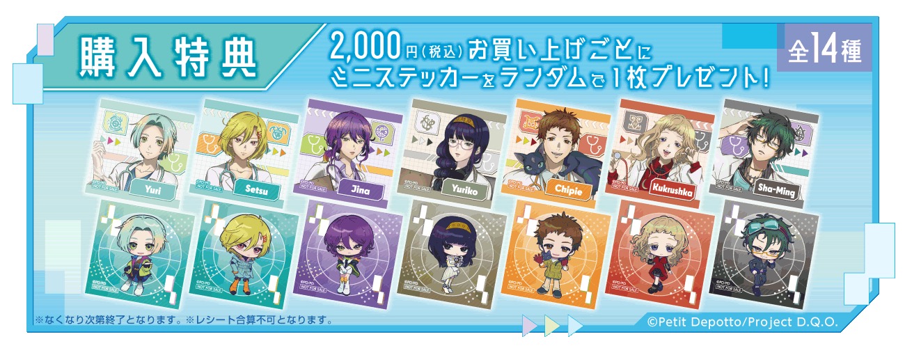 さらに、グッズをお買い上げ2,000円(税込)ごとに特典として描き下ろしノベルティ「ミニステッカー 全14種」をランダムに1枚プレゼント!
