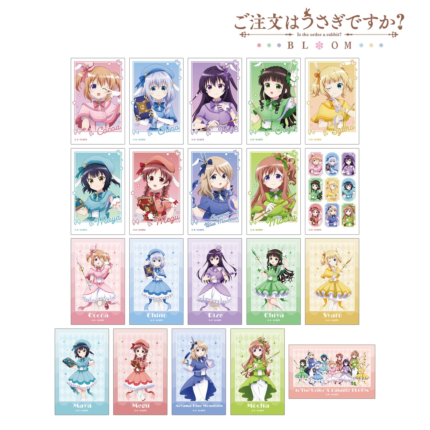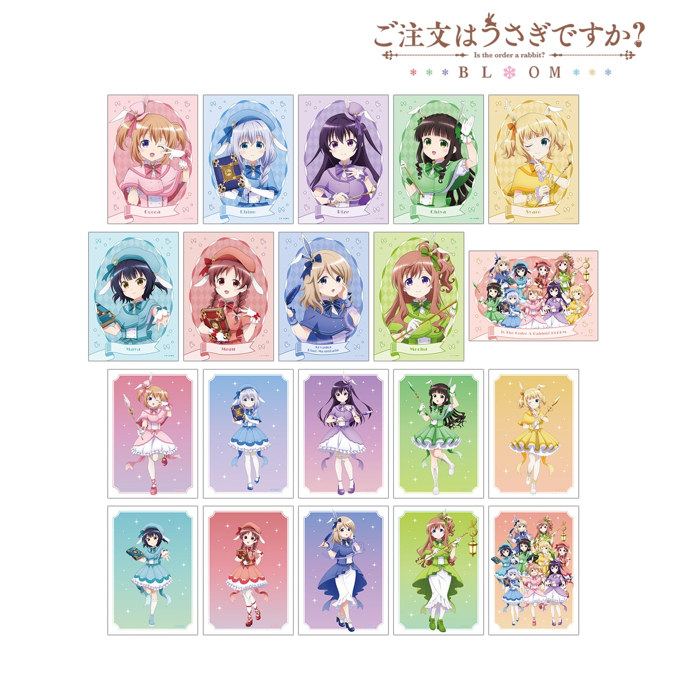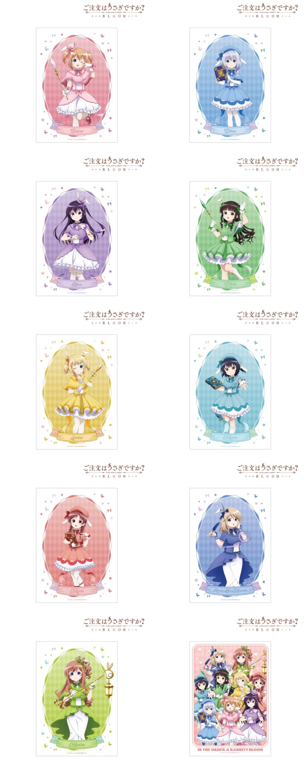 魔法少女の装いでココア、チノ、リゼ、千夜、シャロ、マヤ、メグ、青山ブルーマウンテン、モカの9人が登場。