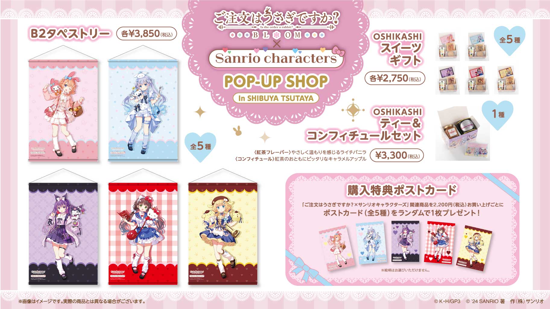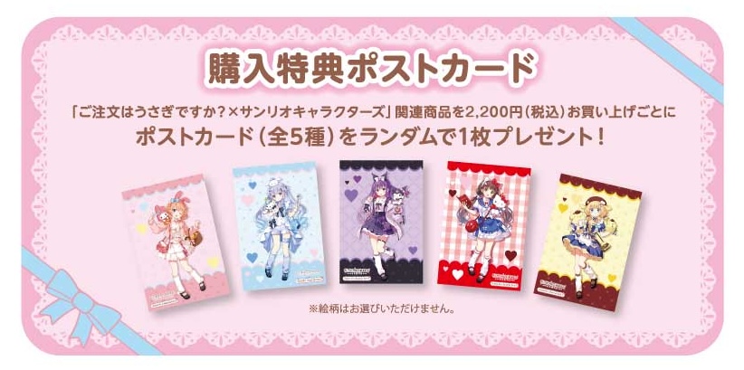 「ご注文はうさぎですか?BLOOM (ごちうさ)」× 「サンリオキャラクターズ」ポップアップストアにて、グッズをお買い上げ2,200円(税込)毎に特典として「ボストカード 全5種」がランダムに1枚プレゼントされる。