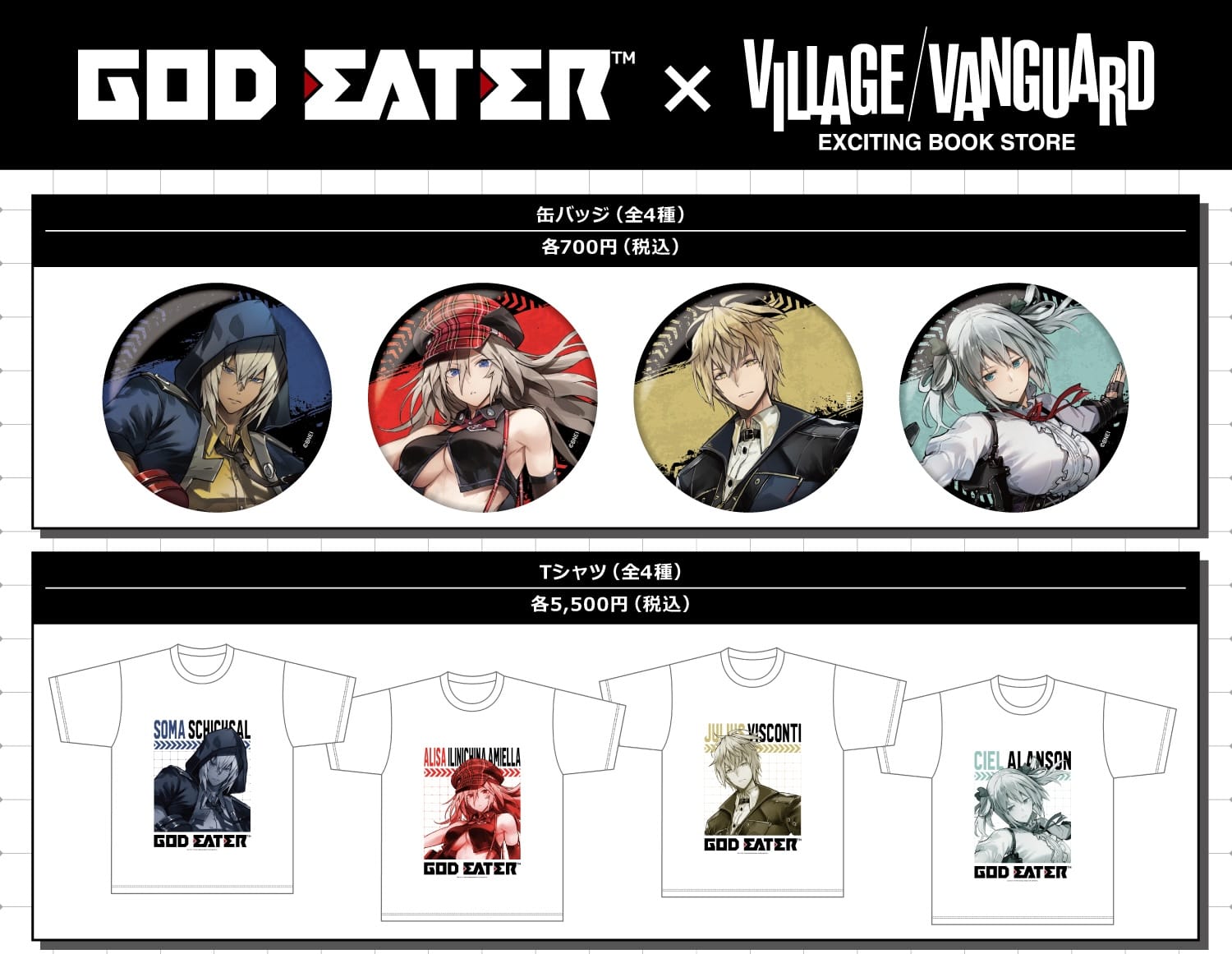 「ゴッドイーター × ヴィレッジヴァンガード」では、西出ケンゴローさんによるソーマ、アリサ、ジュリウス、シエルの描き下ろしイラストを使用したオリジナルグッズが多数ラインナップ!