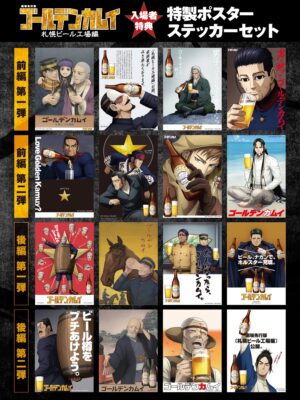 野田サトル先生原作の大人気アニメ「ゴールデンカムイ」最終章の先行上映「劇場先行版 アニメ『ゴールデンカムイ』札幌ビール工場編」の入場者特典第1弾が決定。作品の舞台となるサッポロビール工場に因んで描き下ろされた、サッポロビールと杉元たちの「特製ポスターステッカー」全16種/4種1セットが4回にわけて配布される。