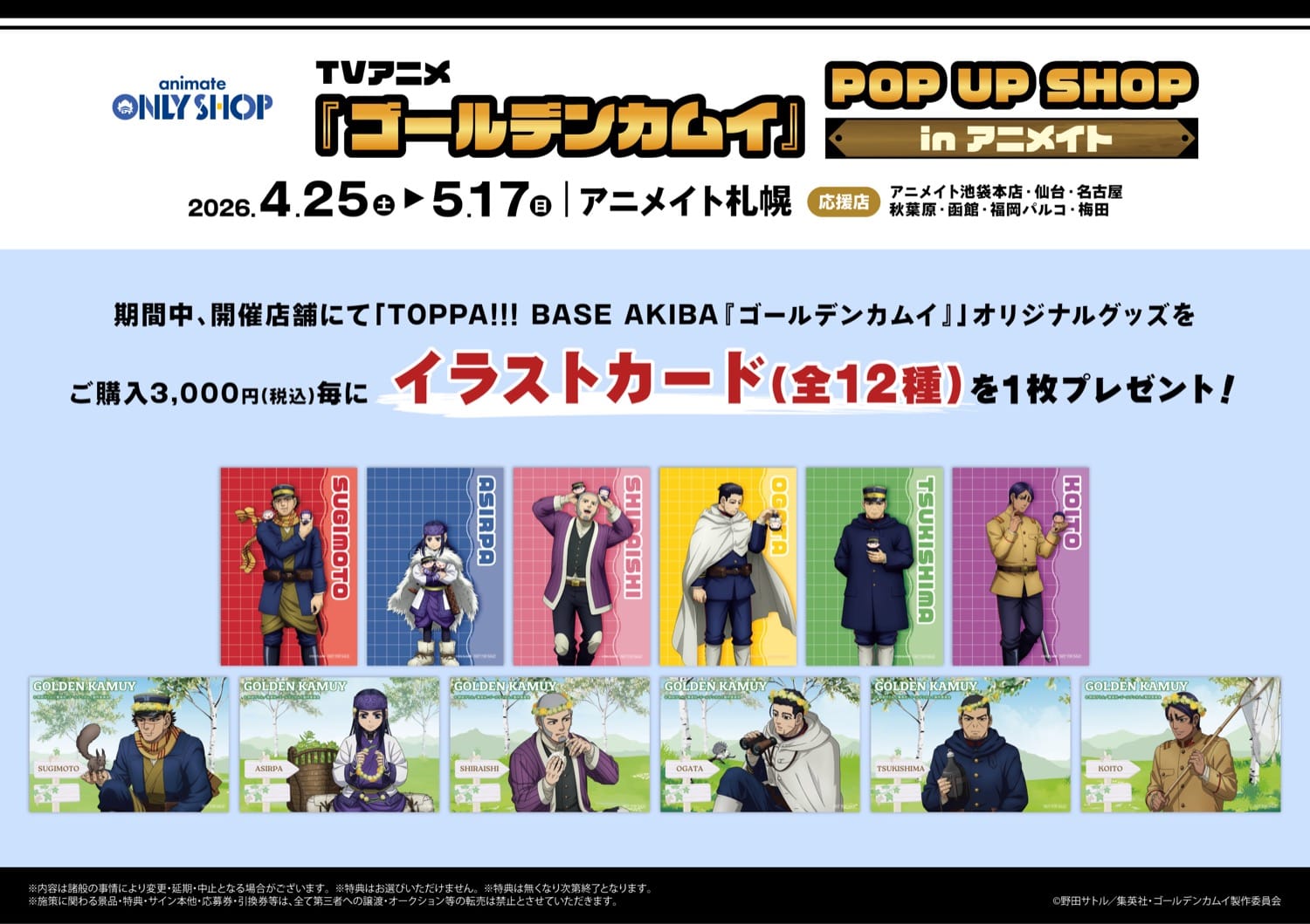 「ゴールデンカムイ」ポップアップストアにて、グッズをお買い上げ3,000円 (税込) 毎に特典として「イラストカード 全12種」がランダムに1枚プレゼントされる。