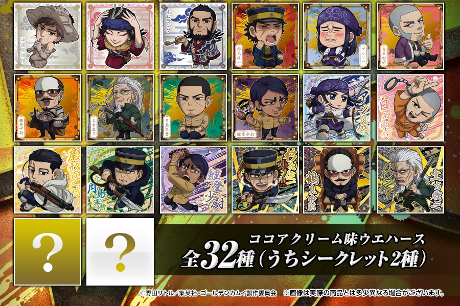 にふぉるめーしょん初登場となる「ゴールデンカムイ」のウエハースには、メタリック仕様のシール1枚(全32種/うちシークレット2種)とココアクリーム味ウエハース1枚が封入!