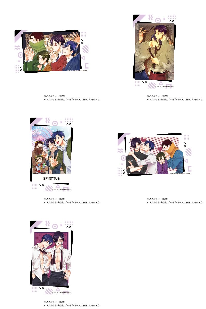スピリタスの先輩バイト「セロ」と「シウ」をはじめ、新人バイト「ミケ」と「ヒュー」らのペアイラストを使用した「アクリルスタンド」や、4人の華麗な姿を堪能できる「ノーブルアート」など全12種がラインナップ。