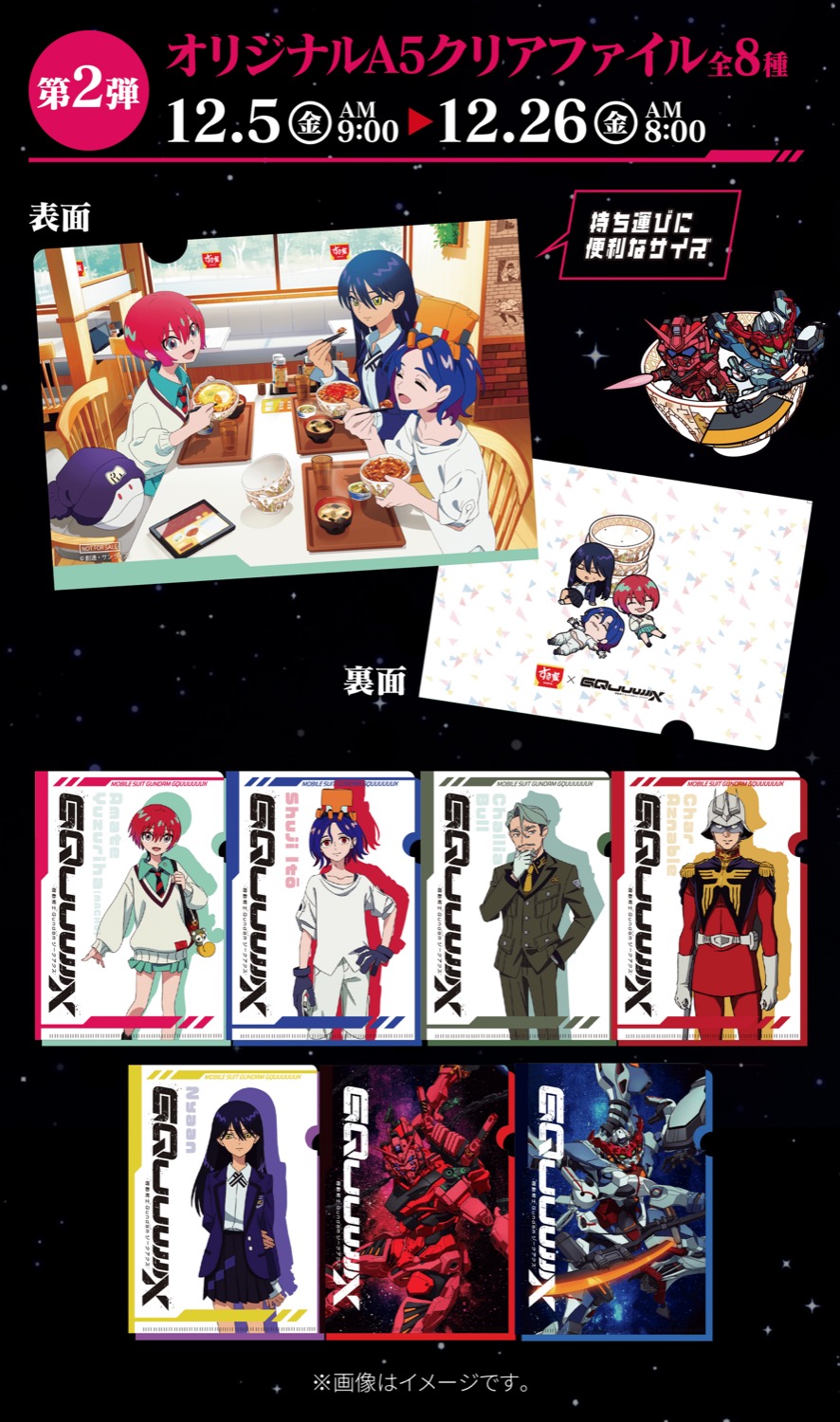 「ジークアクス × すき家全国」コラボキャンペーン期間中、「M.A.V.トッピングセット」を1品注文ごとに、11月18日〜12月5日までは第1弾「オリジナルステッカー 全6種」の中から1枚、12月5日〜12月26日までは「オリジナルA5クリアファイル 全8種」の中から1枚をプレゼント!