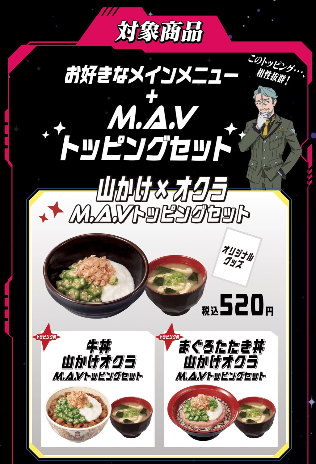「ガンダム ジークアクス × すき家全国」では、お好きなメニューと併せて注文できるコラボセット「M.A.V.トッピングセット」を提供。