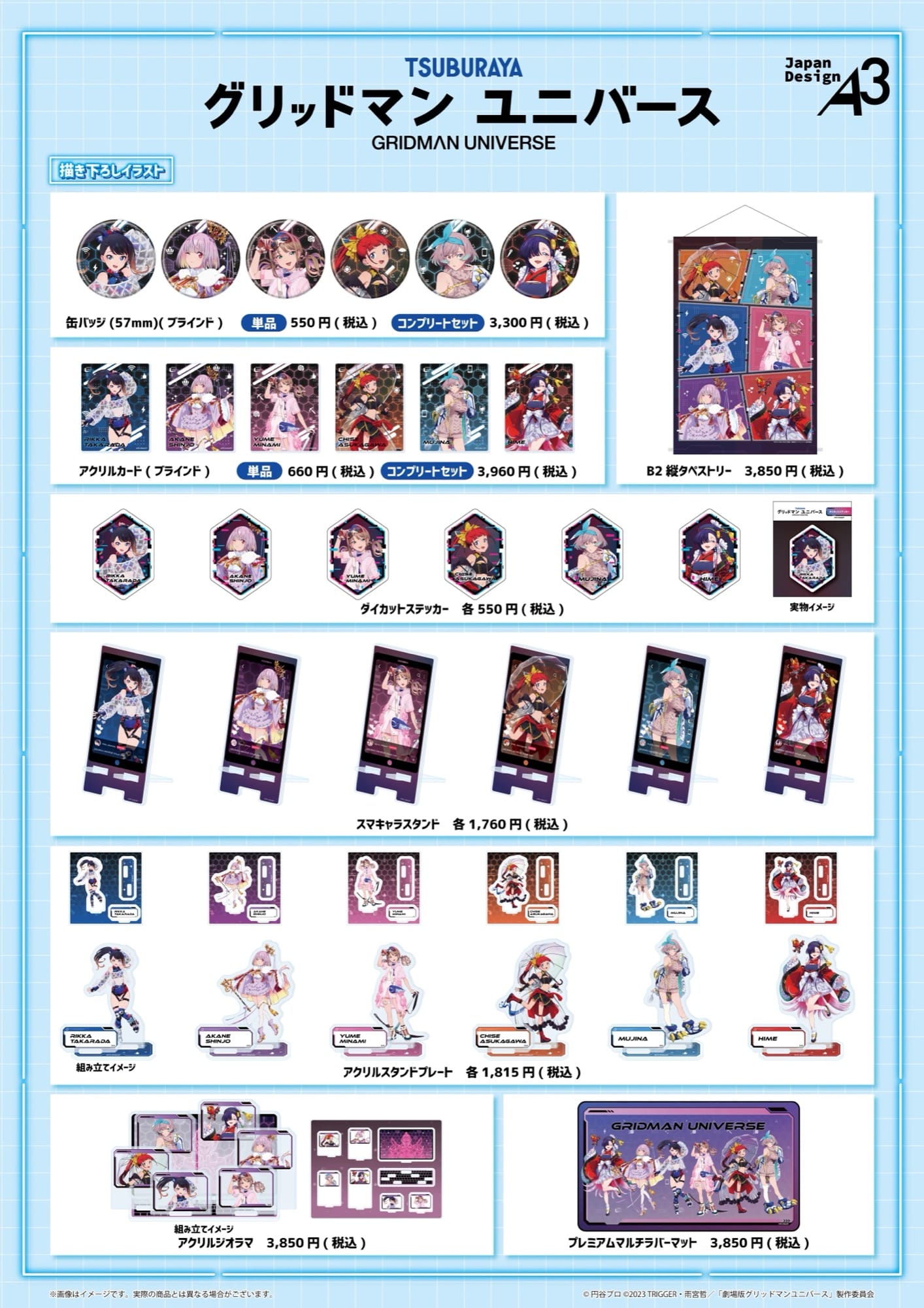 アニメ「グリッドマンユニバース」ポップアップストアでは、「バーチャルライバー」がテーマの新作描き下ろしイラストを使用したグッズが多数販売される他、グッズをお買い上げ2,200円(税込)ごとに特典として描き下ろしノベルティ「ポストカード 全6種」をランダムに1枚プレゼント!