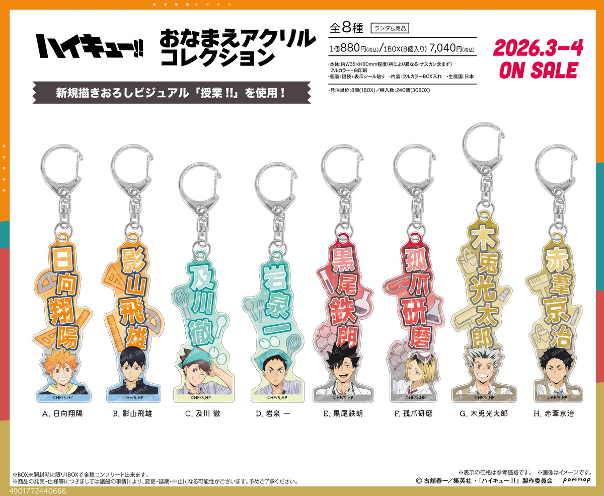 『授業!!』をテーマとしたPOMMOPオリジナルの描き下ろしビジュアルがついに解禁! 烏野高校・青葉城西高校・音駒高校・梟谷学園高校など計4校のバレー部員たちを描いた「おなまえアクリルコレクション」や「アクリルスタンド」がラインナップ。