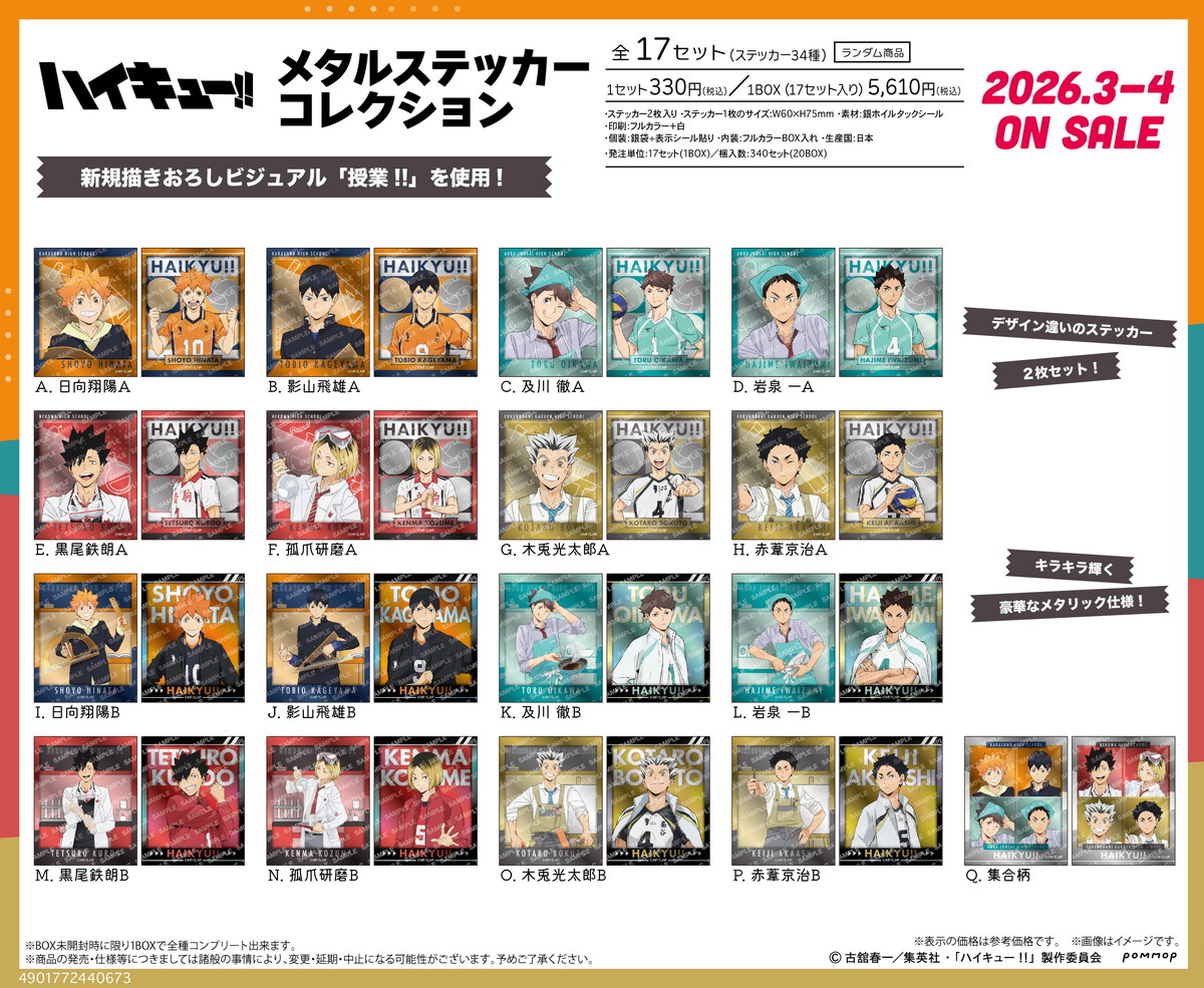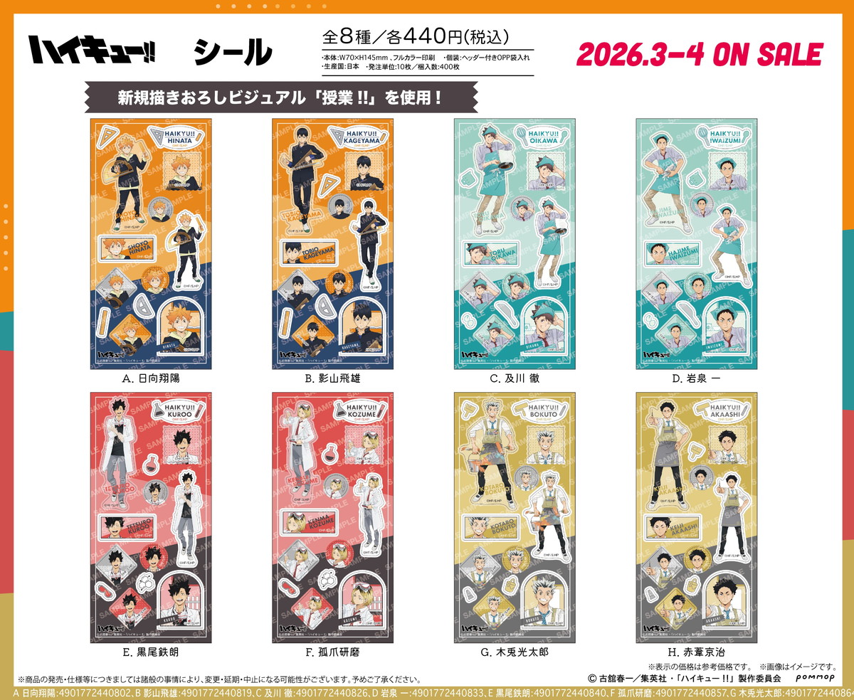 ショウワノート (POMMOP)による新規描き下ろしビジュアル『授業!!』を使用した「缶バッジコレクション」や「シール」など新商品が登場。 日向・影山・及川・岩泉・黒尾・孤爪・木兎・赤葦ら人気キャラクター8人がラインナップ!