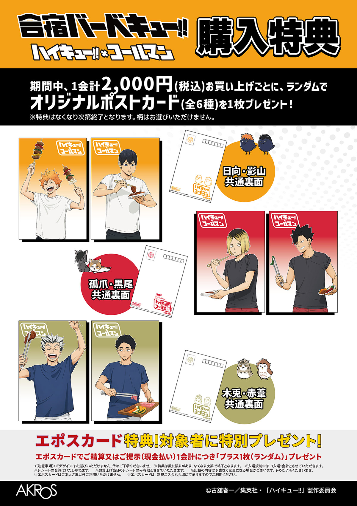 「ハイキュー!!」ポップアップストアにて、グッズをお買い上げ2,000円(税込)毎に特典として「オリジナルポストカード 全6種」がランダムに1枚プレゼントされる。なお、エポスカードでご精算またはご提示(現金払い)すると、1会計につきプラス1枚プレゼントされる。