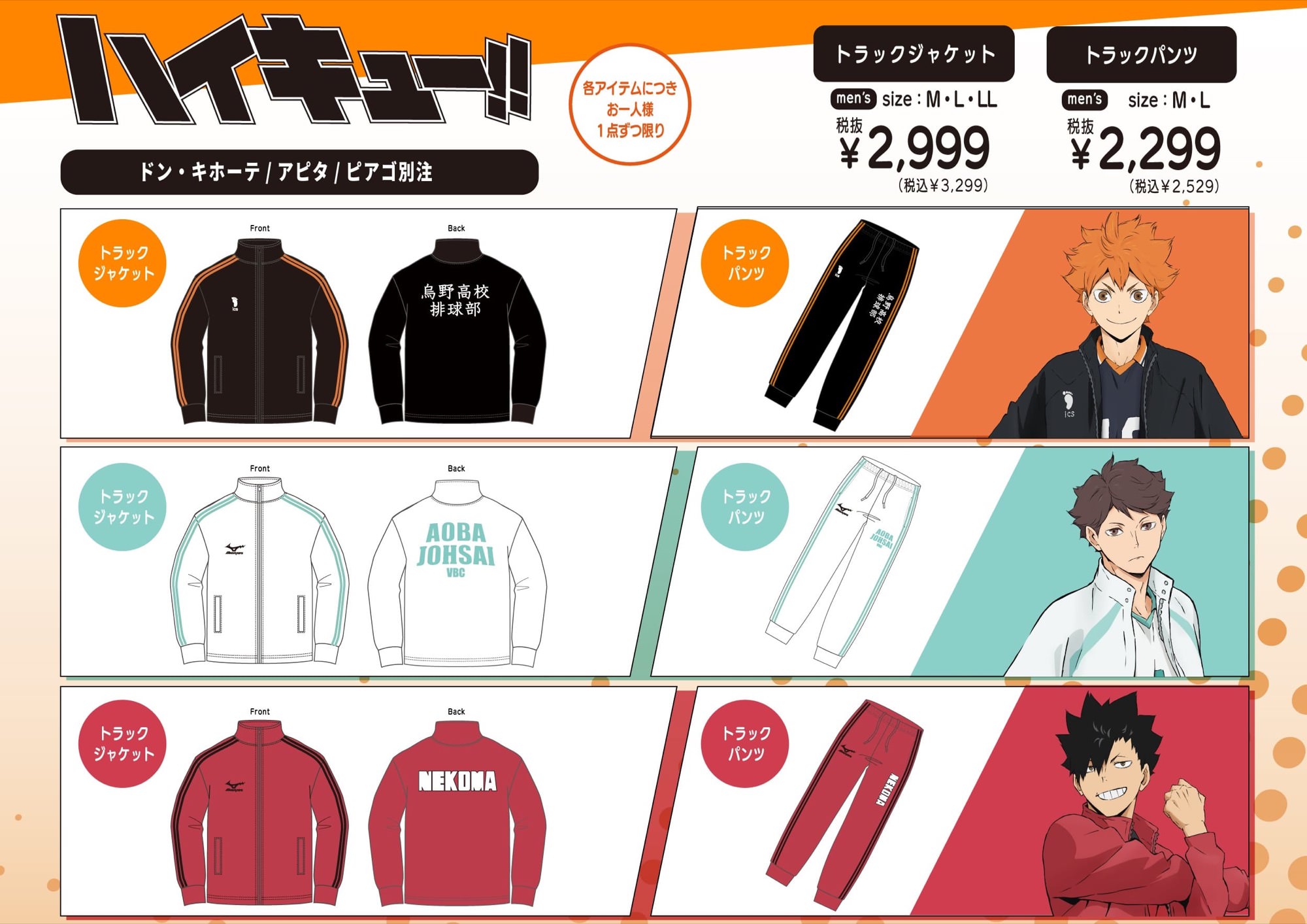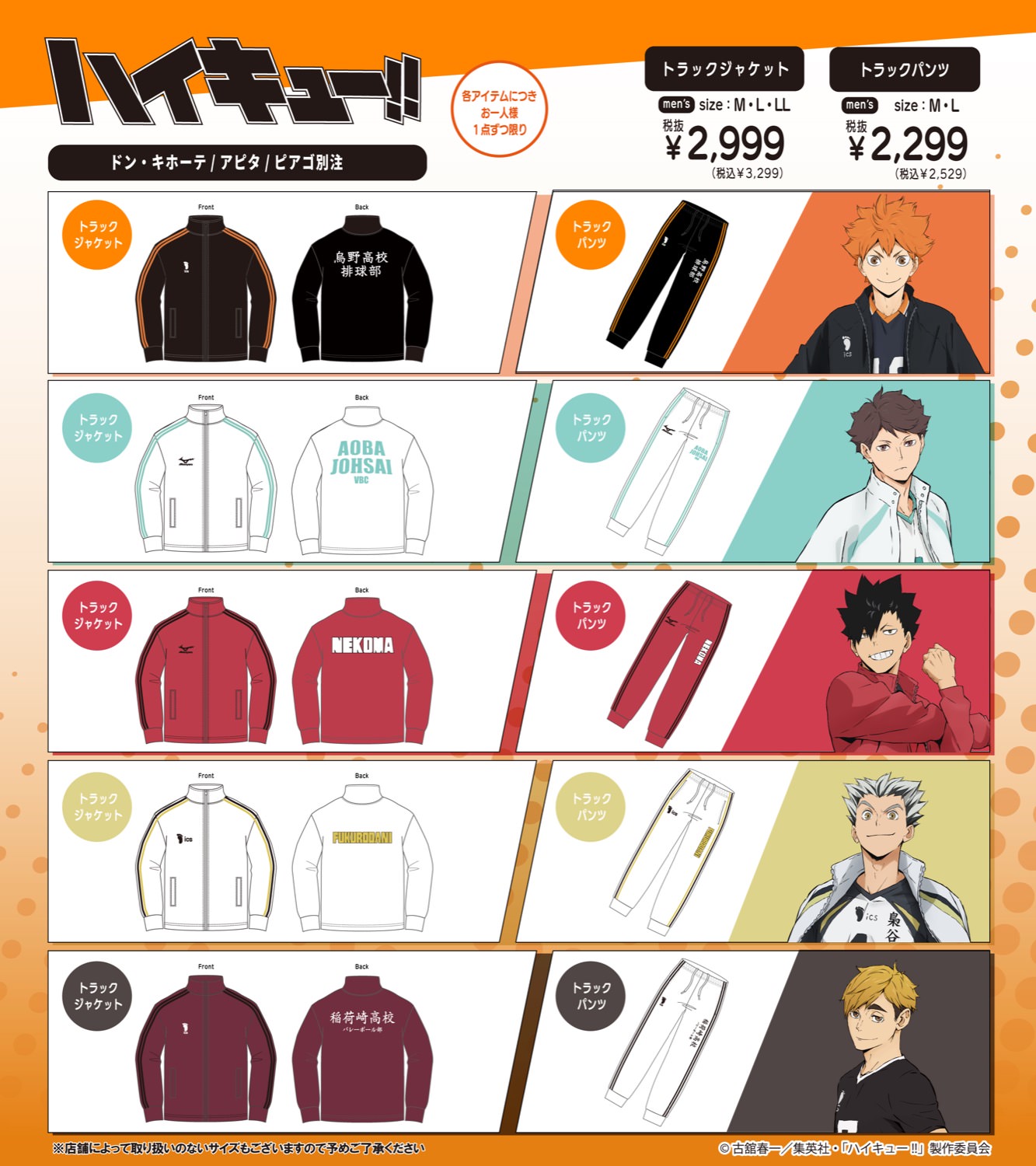 「ハイキュー!! × ドンキ / アピタ / ピアゴ」では、烏野高校・音駒高校・青葉城西高校・梟谷学園高校・稲荷崎高校をイメージした「トラックジャケット」が多数ラインナップ!