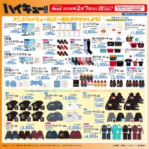 古舘春一先生による大人気バレーボール漫画を原作としたアニメ「ハイキュー!!」× しまむらグループが展開するカジュアルブランド「Avail (アベイル)」全国にて、2026年2月7日より新作グッズが発売される。お出かけに便利な雑貨類や、外出にもルームウェアにも使えるアパレルアイテムも多数登場!