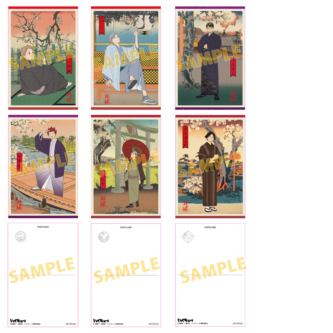 『排球四季景〜春ノ陣〜フェア』では、「浮世絵」をテーマにこだわりが詰まった新規描き下ろしイラストのグッズが販売される他、グッズをお買い上げ1,100円(税込)ごとに特典として描き下ろしノベルティー「ポストカード 全6種」をランダムに1枚プレゼント!