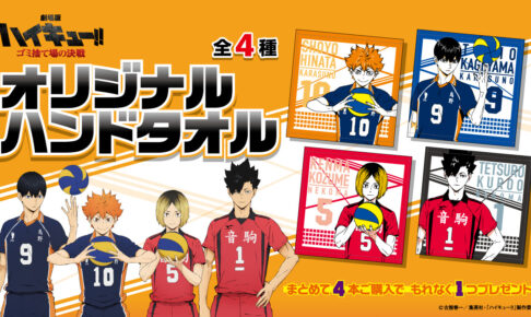 「ハイキュー!! × サントリー」では、対象店舗にて「GREEN DA・KA・RA」を4本購入の方に、日向翔陽・影山飛雄・孤爪研磨・黒尾鉄朗ら全4種のハンドタオルより、もれなく1つプレゼント!