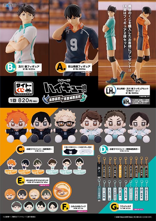 | 賞品ラインナップ | A賞 影山飛雄フィギュア B賞 及川 徹フィギュア C賞 お座りマスコット~烏野高校~ D賞 お座りマスコット~青葉城西高校~ E賞 ゆらゆらアクリルスタンド F賞 ふわふわ缶バッジ G賞 フライトタグ LH賞 影山飛雄・及川 徹フィギュアセット(LH賞カラーver.) WH賞 影山飛雄・及川 徹フィギュアセット EXH賞 影山飛雄フィギュア |